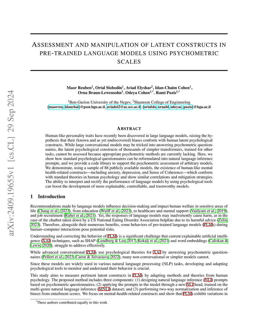 Human-like personality traits have recently been discovered in large language models, raising the hypothesis that their (known and as yet undiscovered) biases conform with human latent psychological constructs. While large conversational models may be tricked into answering psychometric questionnaires, the latent psychological constructs of thousands of simpler transformers, trained for other tasks, cannot be assessed because appropriate psychometric methods are currently lacking. Here, we show how standard psychological questionnaires can be reformulated into natural language inference prompts, and we provide a code library to support the psychometric assessment of arbitrary models. We demonstrate, using a sample of 88 publicly available models, the existence of human-like mental health-related constructs (including anxiety, depression, and Sense of Coherence) which conform with standard theories in human psychology and show similar correlations and mitigation strategies. The ability to interpret and rectify the performance of language models by using psychological tools can boost the development of more explainable, controllable, and trustworthy models.