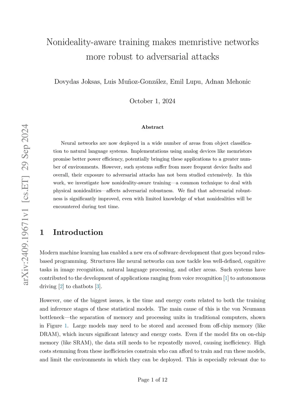 Neural networks are now deployed in a wide number of areas from object classification to natural language systems. Implementations using analog devices like memristors promise better power efficiency, potentially bringing these applications to a greater number of environments. However, such systems suffer from more frequent device faults and overall, their exposure to adversarial attacks has not been studied extensively. In this work, we investigate how nonideality-aware training - a common technique to deal with physical nonidealities - affects adversarial robustness. We find that adversarial robustness is significantly improved, even with limited knowledge of what nonidealities will be encountered during test time.