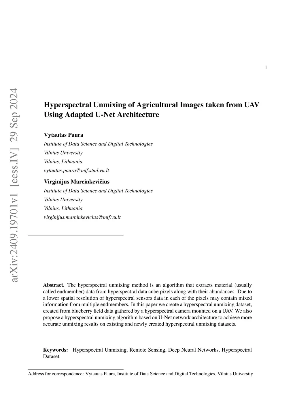 The hyperspectral unmixing method is an algorithm that extracts material (usually called endmember) data from hyperspectral data cube pixels along with their abundances. Due to a lower spatial resolution of hyperspectral sensors data in each of the pixels may contain mixed information from multiple endmembers. In this paper we create a hyperspectral unmixing dataset, created from blueberry field data gathered by a hyperspectral camera mounted on a UAV. We also propose a hyperspectral unmixing algorithm based on U-Net network architecture to achieve more accurate unmixing results on existing and newly created hyperspectral unmixing datasets.