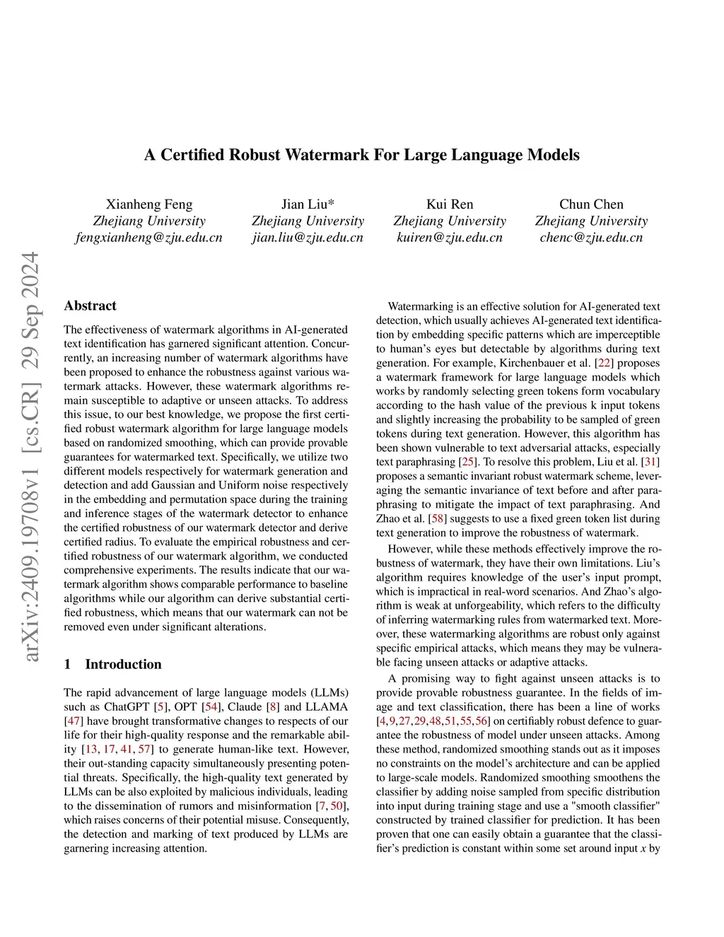 The effectiveness of watermark algorithms in AI-generated text identification has garnered significant attention. Concurrently, an increasing number of watermark algorithms have been proposed to enhance the robustness against various watermark attacks. However, these watermark algorithms remain susceptible to adaptive or unseen attacks. To address this issue, to our best knowledge, we propose the first certified robust watermark algorithm for large language models based on randomized smoothing, which can provide provable guarantees for watermarked text. Specifically, we utilize two different models respectively for watermark generation and detection and add Gaussian and Uniform noise respectively in the embedding and permutation space during the training and inference stages of the watermark detector to enhance the certified robustness of our watermark detector and derive certified radius. To evaluate the empirical robustness and certified robustness of our watermark algorithm, we conducted comprehensive experiments. The results indicate that our watermark algorithm shows comparable performance to baseline algorithms while our algorithm can derive substantial certified robustness, which means that our watermark can not be removed even under significant alterations.