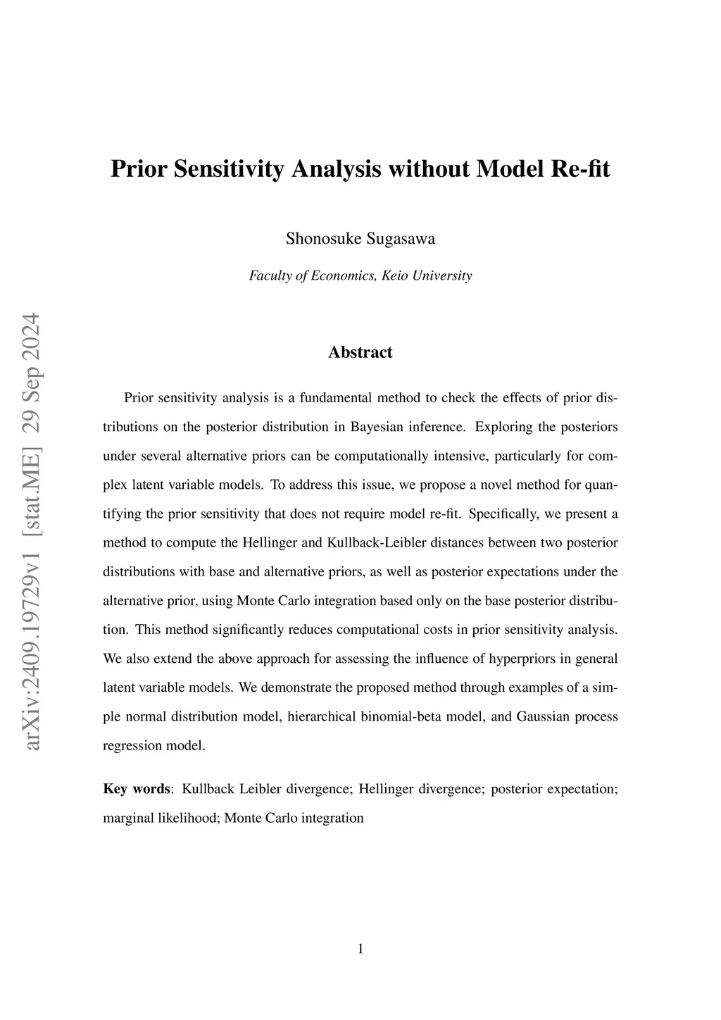 Prior sensitivity analysis is a fundamental method to check the effects of prior distributions on the posterior distribution in Bayesian inference. Exploring the posteriors under several alternative priors can be computationally intensive, particularly for complex latent variable models. To address this issue, we propose a novel method for quantifying the prior sensitivity that does not require model re-fit. Specifically, we present a method to compute the Hellinger and Kullback-Leibler distances between two posterior distributions with base and alternative priors, as well as posterior expectations under the alternative prior, using Monte Carlo integration based only on the base posterior distribution. This method significantly reduces computational costs in prior sensitivity analysis. We also extend the above approach for assessing the influence of hyperpriors in general latent variable models. We demonstrate the proposed method through examples of a simple normal distribution model, hierarchical binomial-beta model, and Gaussian process regression model.
