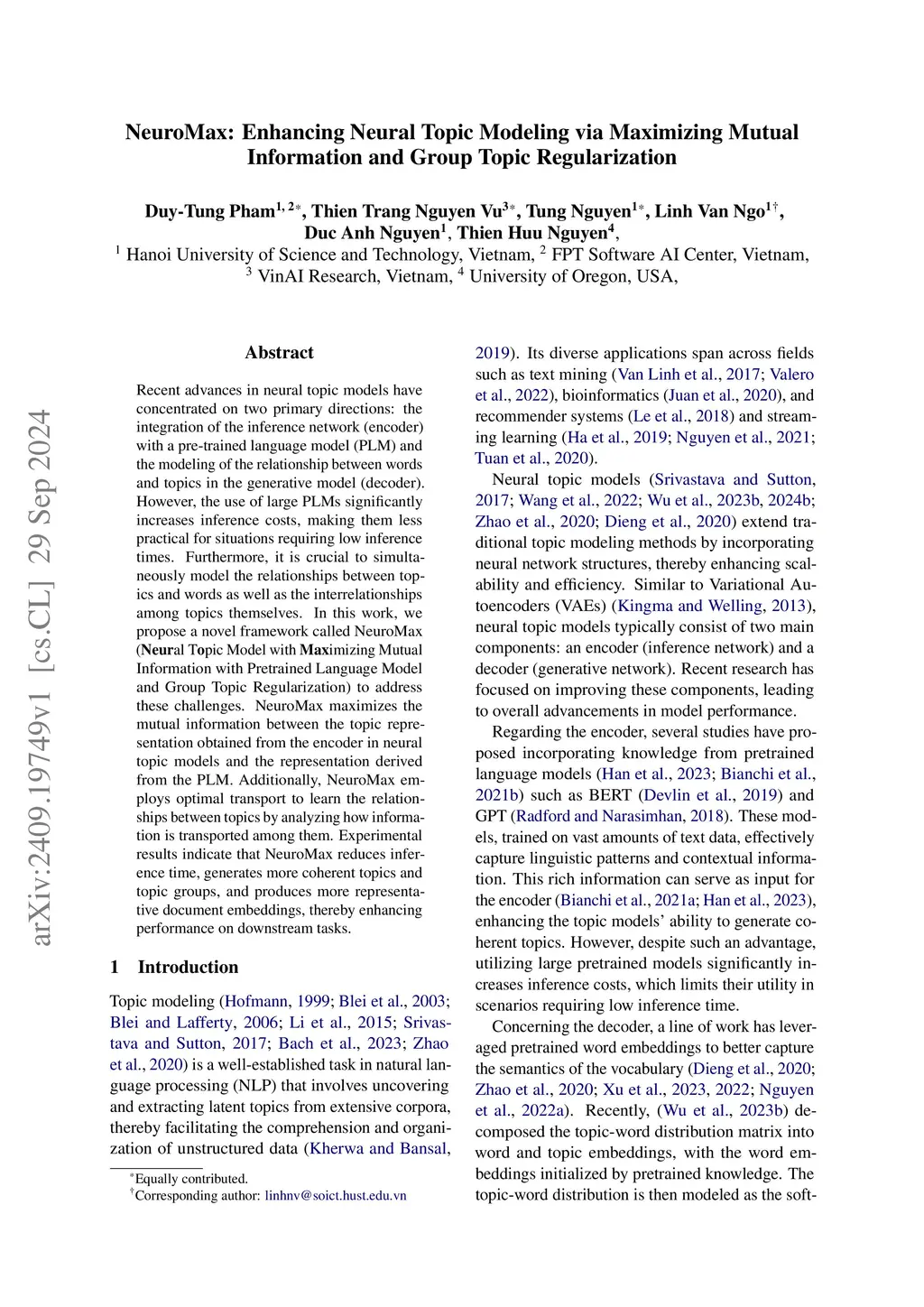 Recent advances in neural topic models have concentrated on two primary directions: the integration of the inference network (encoder) with a pre-trained language model (PLM) and the modeling of the relationship between words and topics in the generative model (decoder). However, the use of large PLMs significantly increases inference costs, making them less practical for situations requiring low inference times. Furthermore, it is crucial to simultaneously model the relationships between topics and words as well as the interrelationships among topics themselves. In this work, we propose a novel framework called NeuroMax (Neural Topic Model with Maximizing Mutual Information with Pretrained Language Model and Group Topic Regularization) to address these challenges. NeuroMax maximizes the mutual information between the topic representation obtained from the encoder in neural topic models and the representation derived from the PLM. Additionally, NeuroMax employs optimal transport to learn the relationships between topics by analyzing how information is transported among them. Experimental results indicate that NeuroMax reduces inference time, generates more coherent topics and topic groups, and produces more representative document embeddings, thereby enhancing performance on downstream tasks.
