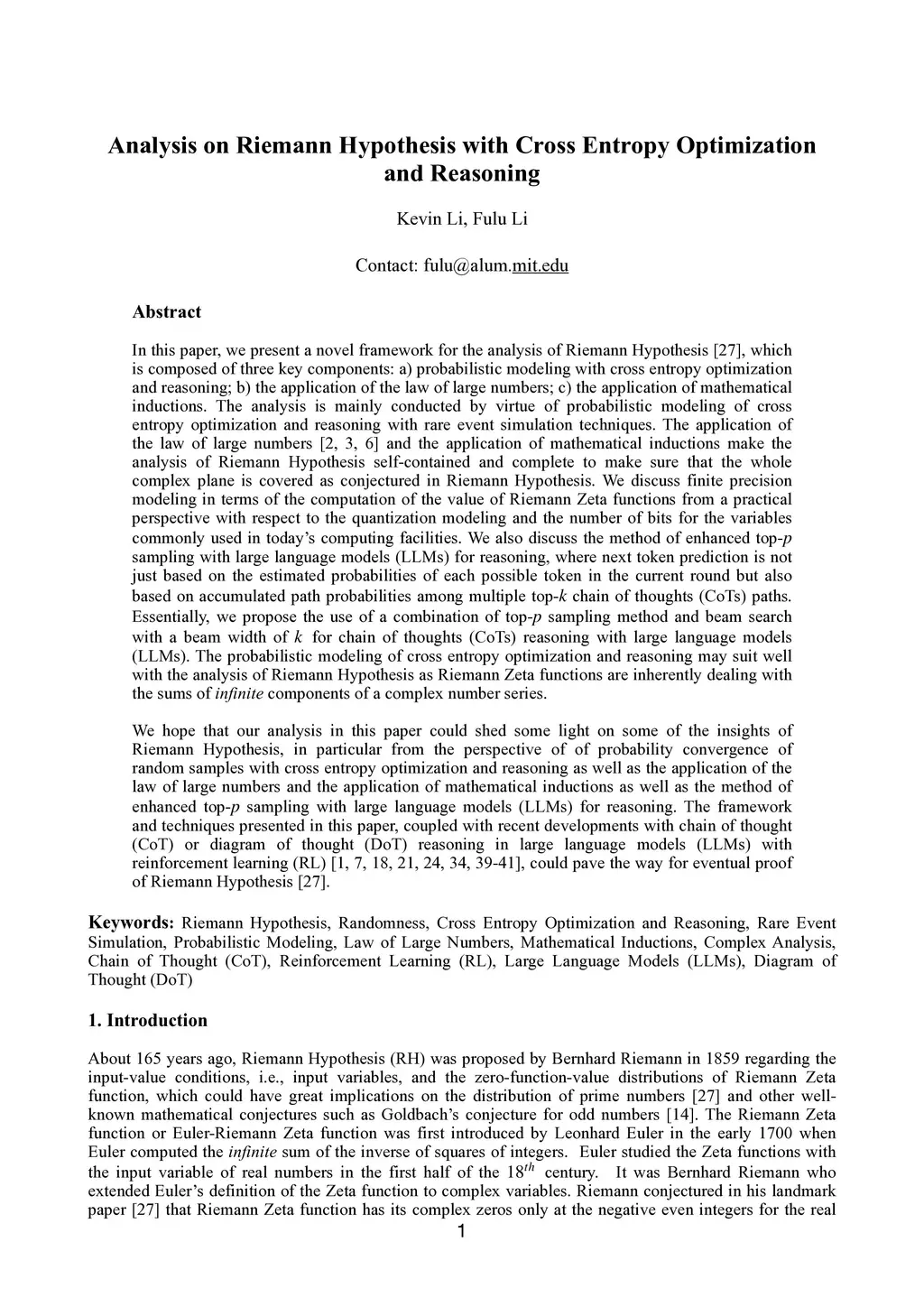 In this paper, we present a novel framework for the analysis of Riemann Hypothesis [27], which is composed of three key components: a) probabilistic modeling with cross entropy optimization and reasoning; b) the application of the law of large numbers; c) the application of mathematical inductions. The analysis is mainly conducted by virtue of probabilistic modeling of cross entropy optimization and reasoning with rare event simulation techniques. The application of the law of large numbers [2, 3, 6] and the application of mathematical inductions make the analysis of Riemann Hypothesis self-contained and complete to make sure that the whole complex plane is covered as conjectured in Riemann Hypothesis. We also discuss the method of enhanced top-p sampling with large language models (LLMs) for reasoning, where next token prediction is not just based on the estimated probabilities of each possible token in the current round but also based on accumulated path probabilities among multiple top-k chain of thoughts (CoTs) paths. The probabilistic modeling of cross entropy optimization and reasoning may suit well with the analysis of Riemann Hypothesis as Riemann Zeta functions are inherently dealing with the sums of infinite components of a complex number series. We hope that our analysis in this paper could shed some light on some of the insights of Riemann Hypothesis. The framework and techniques presented in this paper, coupled with recent developments with chain of thought (CoT) or diagram of thought (DoT) reasoning in large language models (LLMs) with reinforcement learning (RL) [1, 7, 18, 21, 24, 34, 39-41], could pave the way for eventual proof of Riemann Hypothesis [27].