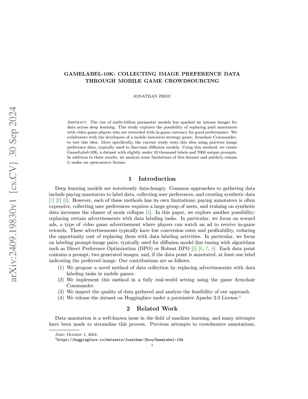 The rise of multi-billion parameter models has sparked an intense hunger for data across deep learning. This study explores the possibility of replacing paid annotators with video game players who are rewarded with in-game currency for good performance. We collaborate with the developers of a mobile historical strategy game, Armchair Commander, to test this idea. More specifically, the current study tests this idea using pairwise image preference data, typically used to fine-tune diffusion models. Using this method, we create GameLabel-10K, a dataset with slightly under 10 thousand labels and 7000 unique prompts. We fine-tune a model on this dataset, we fine-tune Flux Schnell and find an improvement in its prompt adherence, demonstrating the validity of our collection method. In addition, we publicly release both the dataset and our fine-tuned model on Hugging Face.