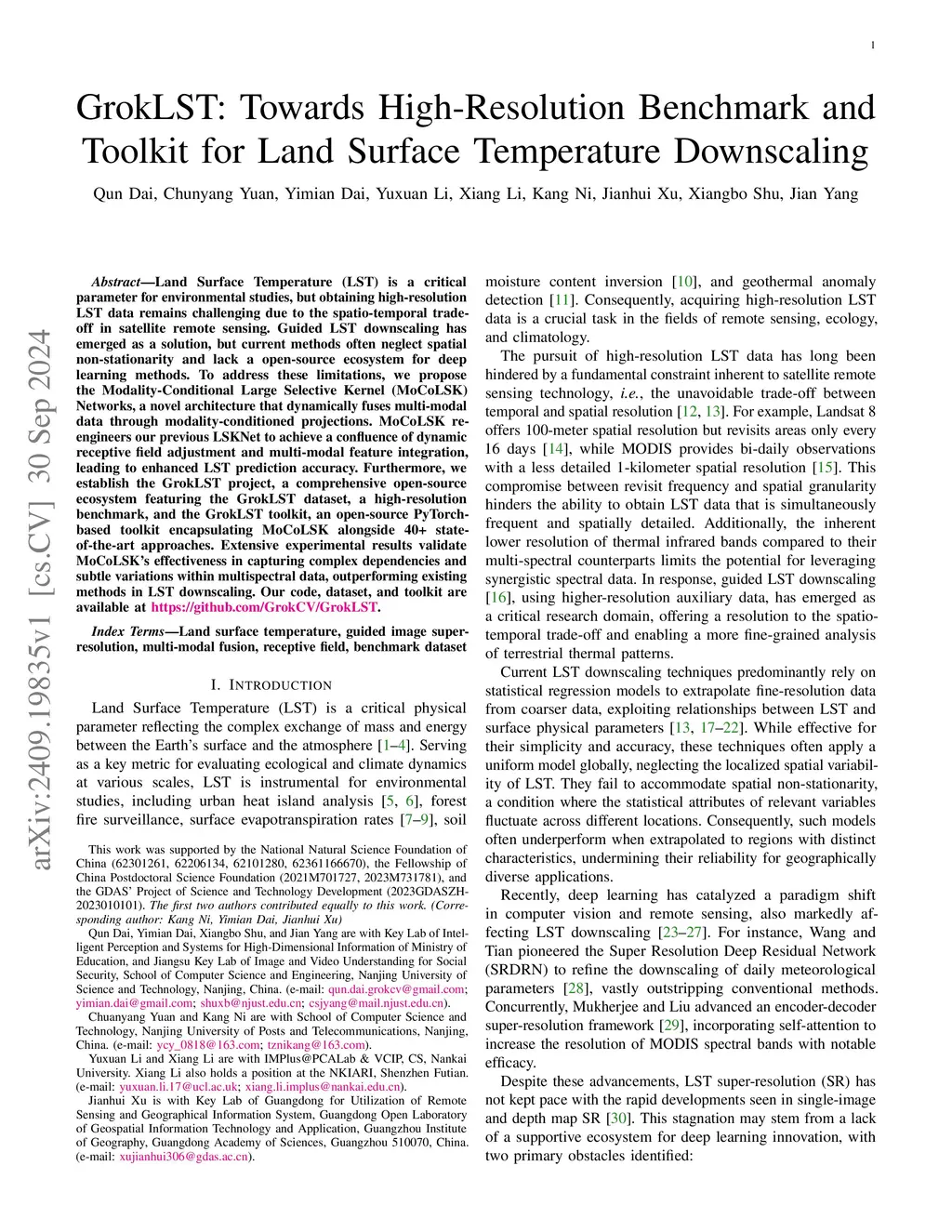 Land Surface Temperature (LST) is a critical parameter for environmental studies, but directly obtaining high spatial resolution LST data remains challenging due to the spatio-temporal trade-off in satellite remote sensing. Guided LST downscaling has emerged as an alternative solution to overcome these limitations, but current methods often neglect spatial non-stationarity, and there is a lack of an open-source ecosystem for deep learning methods. In this paper, we propose the Modality-Conditional Large Selective Kernel (MoCoLSK) Network, a novel architecture that dynamically fuses multi-modal data through modality-conditioned projections. MoCoLSK achieves a confluence of dynamic receptive field adjustment and multi-modal feature fusion, leading to enhanced LST prediction accuracy. Furthermore, we establish the GrokLST project, a comprehensive open-source ecosystem featuring the GrokLST dataset, a high-resolution benchmark, and the GrokLST toolkit, an open-source PyTorch-based toolkit encapsulating MoCoLSK alongside 40+ state-of-the-art approaches. Extensive experimental results validate MoCoLSK's effectiveness in capturing complex dependencies and subtle variations within multispectral data, outperforming existing methods in LST downscaling. Our code, dataset, and toolkit are available atthis https URL.
