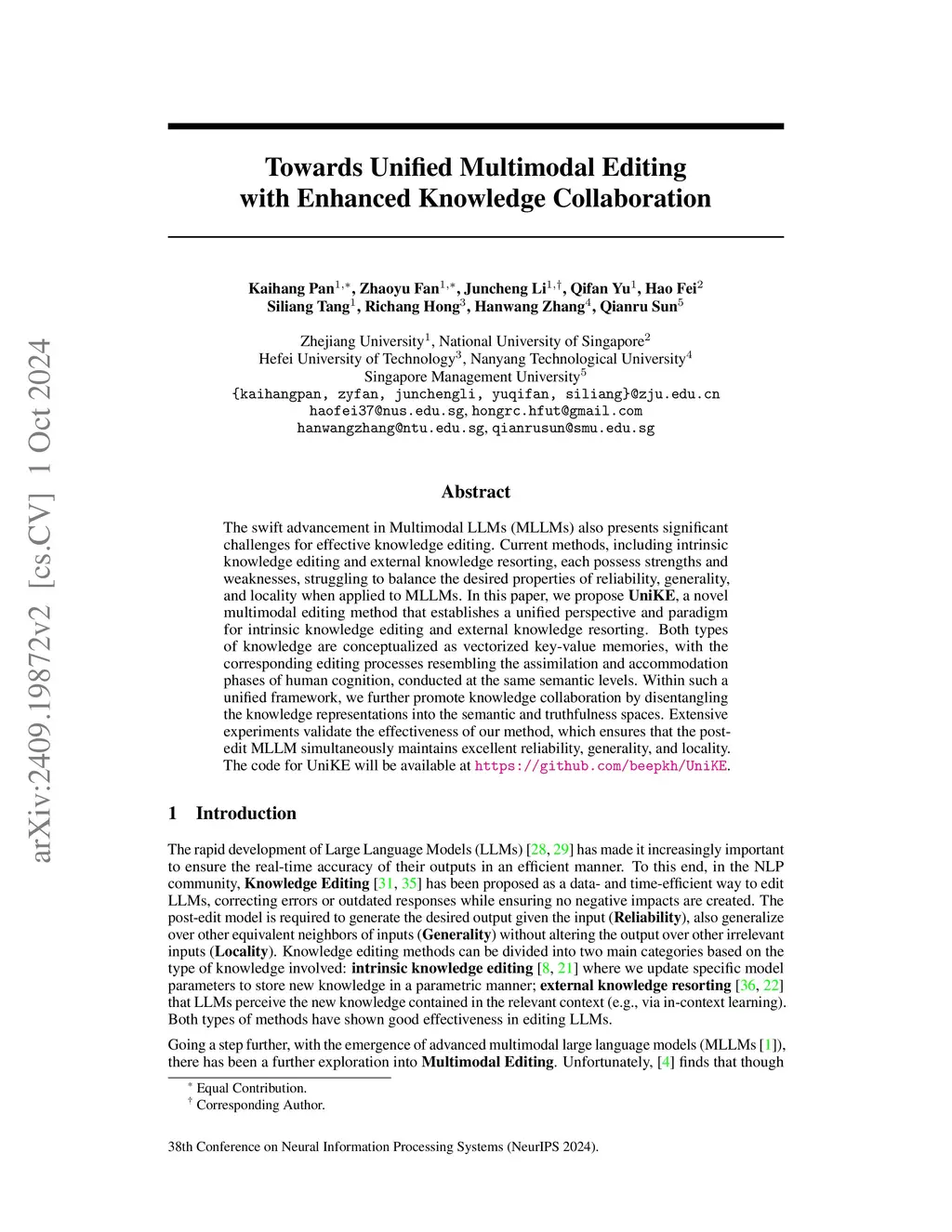 The swift advancement in Multimodal LLMs (MLLMs) also presents significant challenges for effective knowledge editing. Current methods, including intrinsic knowledge editing and external knowledge resorting, each possess strengths and weaknesses, struggling to balance the desired properties of reliability, generality, and locality when applied to MLLMs. In this paper, we propose UniKE, a novel multimodal editing method that establishes a unified perspective and paradigm for intrinsic knowledge editing and external knowledge resorting. Both types of knowledge are conceptualized as vectorized key-value memories, with the corresponding editing processes resembling the assimilation and accommodation phases of human cognition, conducted at the same semantic levels. Within such a unified framework, we further promote knowledge collaboration by disentangling the knowledge representations into the semantic and truthfulness spaces. Extensive experiments validate the effectiveness of our method, which ensures that the post-edit MLLM simultaneously maintains excellent reliability, generality, and locality. The code for UniKE is available at \url{https://github.com/beepkh/UniKE}.