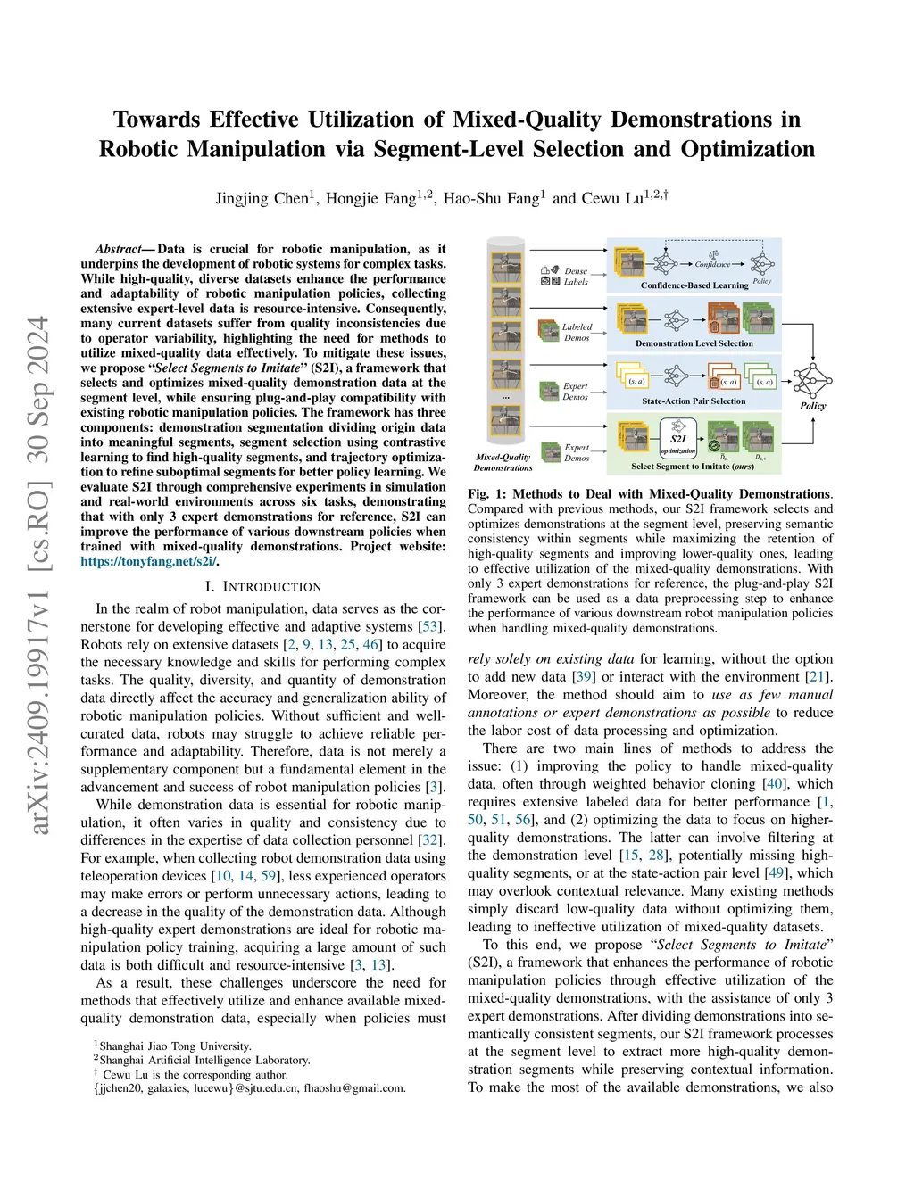 Data is crucial for robotic manipulation, as it underpins the development of robotic systems for complex tasks. While high-quality, diverse datasets enhance the performance and adaptability of robotic manipulation policies, collecting extensive expert-level data is resource-intensive. Consequently, many current datasets suffer from quality inconsistencies due to operator variability, highlighting the need for methods to utilize mixed-quality data effectively. To mitigate these issues, we propose "Select Segments to Imitate" (S2I), a framework that selects and optimizes mixed-quality demonstration data at the segment level, while ensuring plug-and-play compatibility with existing robotic manipulation policies. The framework has three components: demonstration segmentation dividing origin data into meaningful segments, segment selection using contrastive learning to find high-quality segments, and trajectory optimization to refine suboptimal segments for better policy learning. We evaluate S2I through comprehensive experiments in simulation and real-world environments across six tasks, demonstrating that with only 3 expert demonstrations for reference, S2I can improve the performance of various downstream policies when trained with mixed-quality demonstrations. Project website:this https URL.