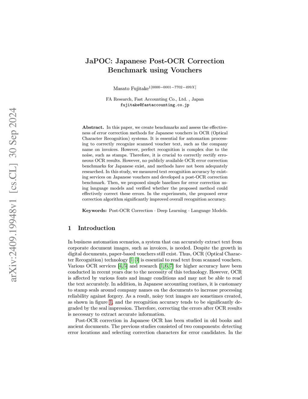 JaPOC: Japanese Post-OCR Correction Benchmark using Vouchers