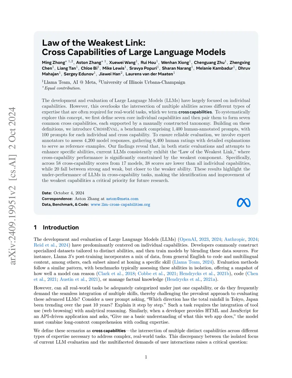 The development and evaluation of Large Language Models (LLMs) have largely focused on individual capabilities. However, this overlooks the intersection of multiple abilities across different types of expertise that are often required for real-world tasks, which we term cross capabilities. To systematically explore this concept, we first define seven core individual capabilities and then pair them to form seven common cross capabilities, each supported by a manually constructed taxonomy. Building on these definitions, we introduce CrossEval, a benchmark comprising 1,400 human-annotated prompts, with 100 prompts for each individual and cross capability. To ensure reliable evaluation, we involve expert annotators to assess 4,200 model responses, gathering 8,400 human ratings with detailed explanations to serve as reference examples. Our findings reveal that, in both static evaluations and attempts to enhance specific abilities, current LLMs consistently exhibit the "Law of the Weakest Link," where cross-capability performance is significantly constrained by the weakest component. Specifically, across 58 cross-capability scores from 17 models, 38 scores are lower than all individual capabilities, while 20 fall between strong and weak, but closer to the weaker ability. These results highlight the under-performance of LLMs in cross-capability tasks, making the identification and improvement of the weakest capabilities a critical priority for future research to optimize performance in complex, multi-dimensional scenarios.
