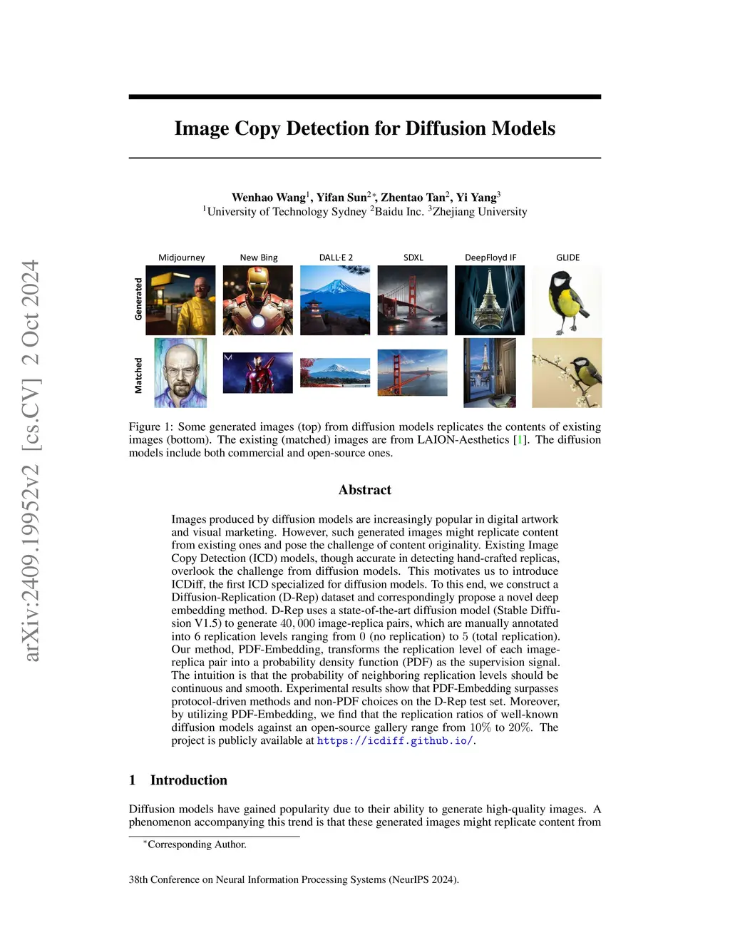 Images produced by diffusion models are increasingly popular in digital artwork and visual marketing. However, such generated images might replicate content from existing ones and pose the challenge of content originality. Existing Image Copy Detection (ICD) models, though accurate in detecting hand-crafted replicas, overlook the challenge from diffusion models. This motivates us to introduce ICDiff, the first ICD specialized for diffusion models. To this end, we construct a Diffusion-Replication (D-Rep) dataset and correspondingly propose a novel deep embedding method. D-Rep uses a state-of-the-art diffusion model (Stable Diffusion V1.5) to generate 40, 000 image-replica pairs, which are manually annotated into 6 replication levels ranging from 0 (no replication) to 5 (total replication). Our method, PDF-Embedding, transforms the replication level of each image-replica pair into a probability density function (PDF) as the supervision signal. The intuition is that the probability of neighboring replication levels should be continuous and smooth. Experimental results show that PDF-Embedding surpasses protocol-driven methods and non-PDF choices on the D-Rep test set. Moreover, by utilizing PDF-Embedding, we find that the replication ratios of well-known diffusion models against an open-source gallery range from 10% to 20%. The project is publicly available at https://icdiff.github.io/.