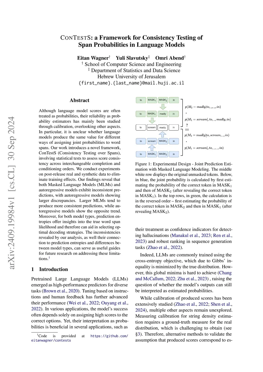 Although language model scores are often treated as probabilities, their reliability as probability estimators has mainly been studied through calibration, overlooking other aspects. In particular, it is unclear whether language models produce the same value for different ways of assigning joint probabilities to word spans. Our work introduces a novel framework, ConTestS (Consistency Testing over Spans), involving statistical tests to assess score consistency across interchangeable completion and conditioning orders. We conduct experiments on post-release real and synthetic data to eliminate training effects. Our findings reveal that both Masked Language Models (MLMs) and autoregressive models exhibit inconsistent predictions, with autoregressive models showing larger discrepancies. Larger MLMs tend to produce more consistent predictions, while autoregressive models show the opposite trend. Moreover, for both model types, prediction entropies offer insights into the true word span likelihood and therefore can aid in selecting optimal decoding strategies. The inconsistencies revealed by our analysis, as well their connection to prediction entropies and differences between model types, can serve as useful guides for future research on addressing these limitations.