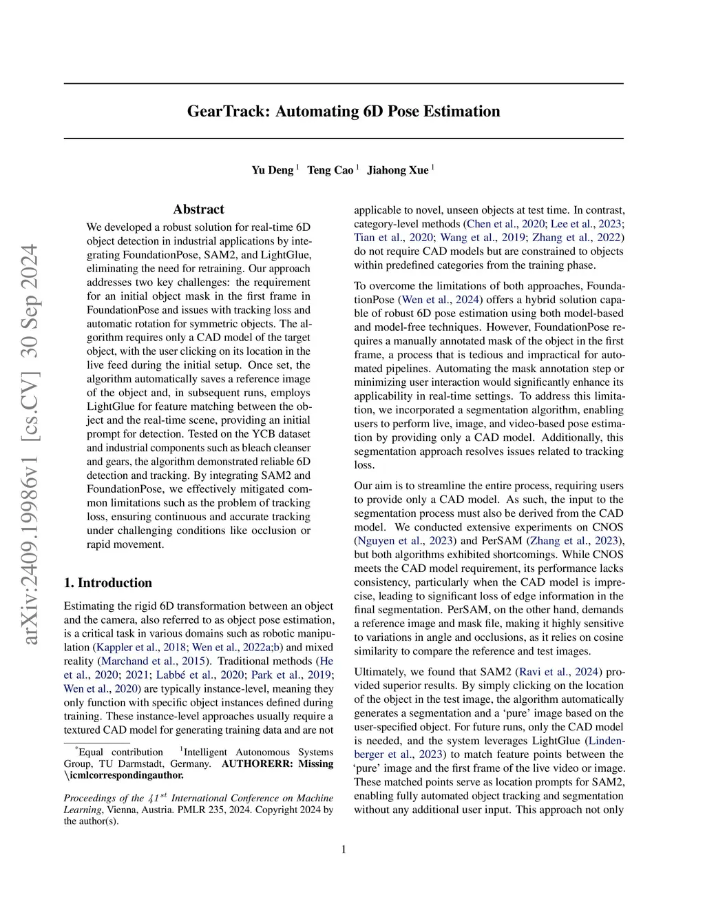 We developed a robust solution for real-time 6D object detection in industrial applications by integrating FoundationPose, SAM2, and LightGlue, eliminating the need for retraining. Our approach addresses two key challenges: the requirement for an initial object mask in the first frame in FoundationPose and issues with tracking loss and automatic rotation for symmetric objects. The algorithm requires only a CAD model of the target object, with the user clicking on its location in the live feed during the initial setup. Once set, the algorithm automatically saves a reference image of the object and, in subsequent runs, employs LightGlue for feature matching between the object and the real-time scene, providing an initial prompt for detection. Tested on the YCB dataset and industrial components such as bleach cleanser and gears, the algorithm demonstrated reliable 6D detection and tracking. By integrating SAM2 and FoundationPose, we effectively mitigated common limitations such as the problem of tracking loss, ensuring continuous and accurate tracking under challenging conditions like occlusion or rapid movement.