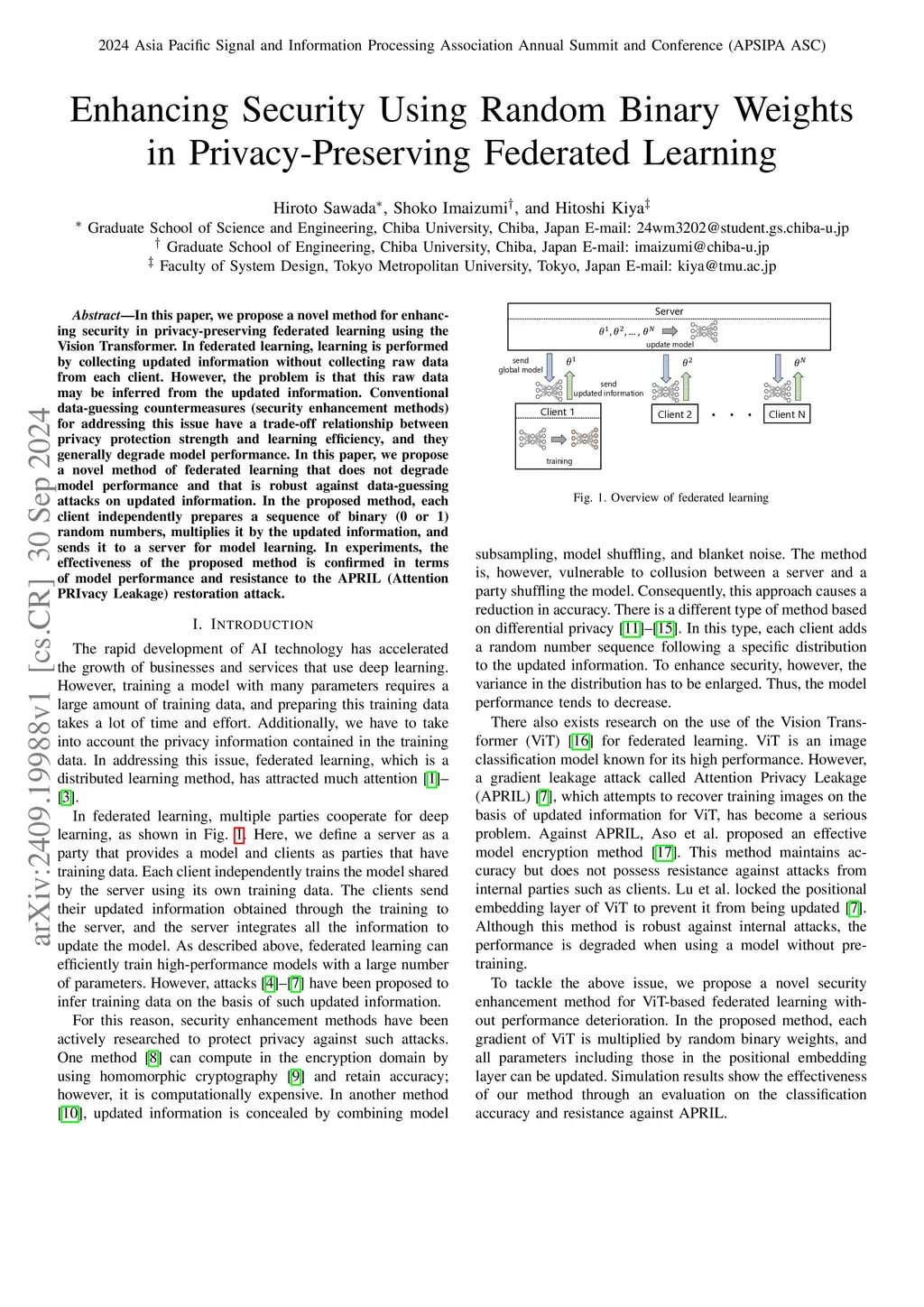 In this paper, we propose a novel method for enhancing security in privacy-preserving federated learning using the Vision Transformer. In federated learning, learning is performed by collecting updated information without collecting raw data from each client. However, the problem is that this raw data may be inferred from the updated information. Conventional data-guessing countermeasures (security enhancement methods) for addressing this issue have a trade-off relationship between privacy protection strength and learning efficiency, and they generally degrade model performance. In this paper, we propose a novel method of federated learning that does not degrade model performance and that is robust against data-guessing attacks on updated information. In the proposed method, each client independently prepares a sequence of binary (0 or 1) random numbers, multiplies it by the updated information, and sends it to a server for model learning. In experiments, the effectiveness of the proposed method is confirmed in terms of model performance and resistance to the APRIL (Attention PRIvacy Leakage) restoration attack.
