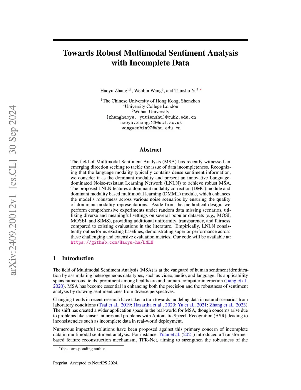Towards Robust Multimodal Sentiment Analysis with Incomplete Data
