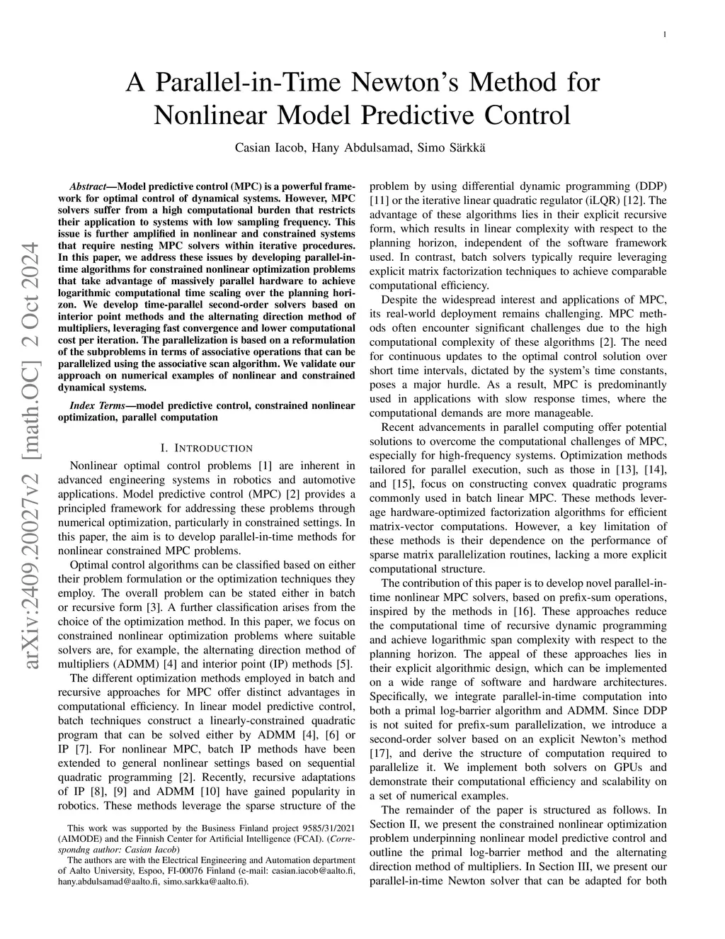 Model predictive control (MPC) is a powerful framework for optimal control of dynamical systems. However, MPC solvers suffer from a high computational burden that restricts their application to systems with low sampling frequency. This issue is further amplified in nonlinear and constrained systems that require nesting MPC solvers within iterative procedures. In this paper, we address these issues by developing parallel-in-time algorithms for constrained nonlinear optimization problems that take advantage of massively parallel hardware to achieve logarithmic computational time scaling over the planning horizon. We develop time-parallel second-order solvers based on interior point methods and the alternating direction method of multipliers, leveraging fast convergence and lower computational cost per iteration. The parallelization is based on a reformulation of the subproblems in terms of associative operations that can be parallelized using the associative scan algorithm. We validate our approach on numerical examples of nonlinear and constrained dynamical systems.