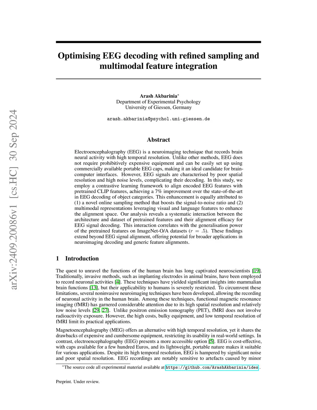 Electroencephalography (EEG) is a neuroimaging technique that records brain neural activity with high temporal resolution. Unlike other methods, EEG does not require prohibitively expensive equipment and can be easily set up using commercially available portable EEG caps, making it an ideal candidate for brain-computer interfaces. However, EEG signals are characterised by poor spatial resolution and high noise levels, complicating their decoding. In this study, we employ a contrastive learning framework to align encoded EEG features with pretrained CLIP features, achieving a 7% improvement over the state-of-the-art in EEG decoding of object categories. This enhancement is equally attributed to (1) a novel online sampling method that boosts the signal-to-noise ratio and (2) multimodal representations leveraging visual and language features to enhance the alignment space. Our analysis reveals a systematic interaction between the architecture and dataset of pretrained features and their alignment efficacy for EEG signal decoding. This interaction correlates with the generalisation power of the pretrained features on ImageNet-O/A datasets (). These findings extend beyond EEG signal alignment, offering potential for broader applications in neuroimaging decoding and generic feature alignments.
