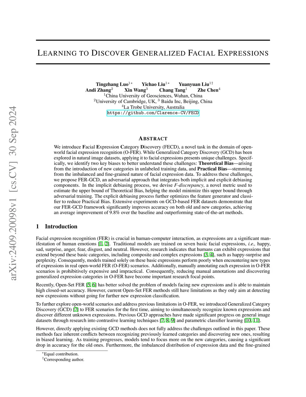 We introduce Facial Expression Category Discovery (FECD), a novel task in the domain of open-world facial expression recognition (O-FER). While Generalized Category Discovery (GCD) has been explored in natural image datasets, applying it to facial expressions presents unique challenges. Specifically, we identify two key biases to better understand these challenges: Theoretical Bias-arising from the introduction of new categories in unlabeled training data, and Practical Bias-stemming from the imbalanced and fine-grained nature of facial expression data. To address these challenges, we propose FER-GCD, an adversarial approach that integrates both implicit and explicit debiasing components. In the implicit debiasing process, we devise F-discrepancy, a novel metric used to estimate the upper bound of Theoretical Bias, helping the model minimize this upper bound through adversarial training. The explicit debiasing process further optimizes the feature generator and classifier to reduce Practical Bias. Extensive experiments on GCD-based FER datasets demonstrate that our FER-GCD framework significantly improves accuracy on both old and new categories, achieving an average improvement of 9.8% over the baseline and outperforming state-of-the-art methods.