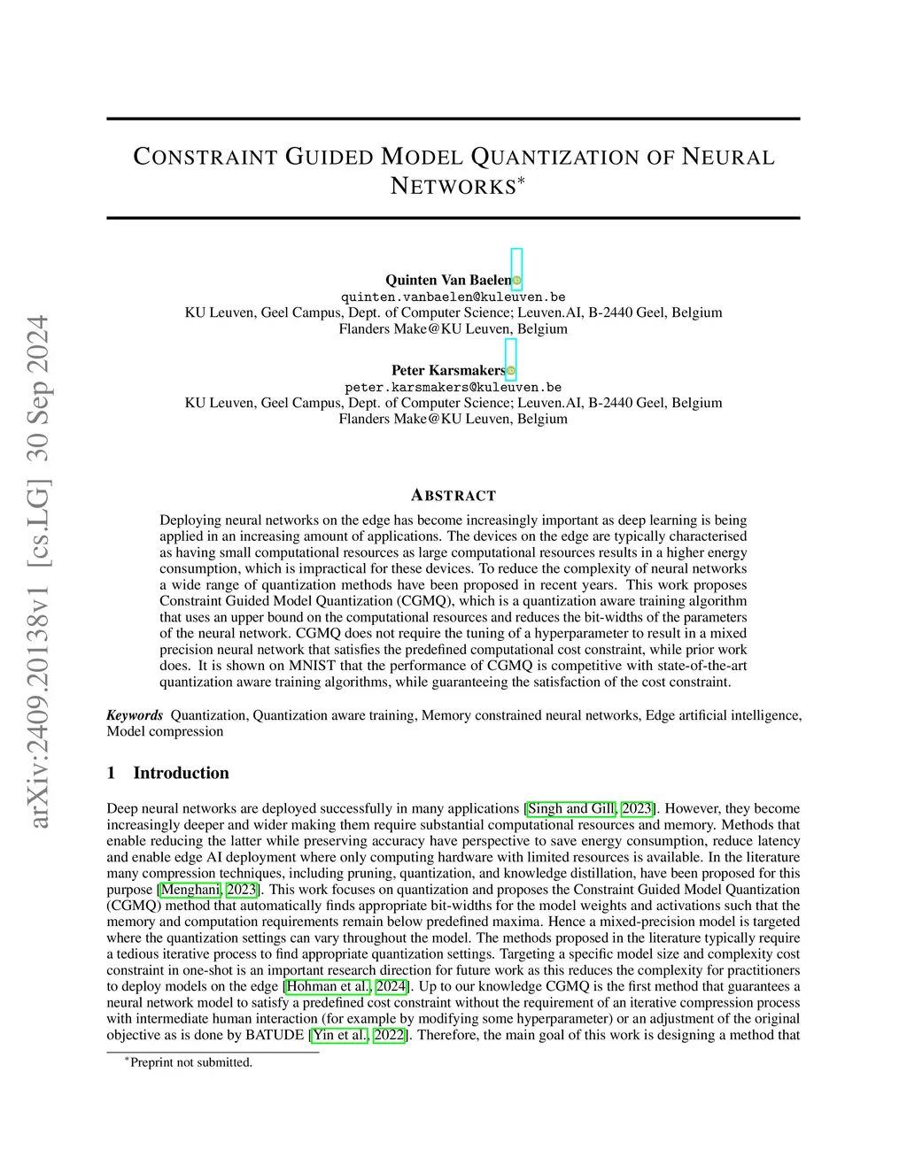 Deploying neural networks on the edge has become increasingly important as deep learning is being applied in an increasing amount of applications. At the edge computing hardware typically has limited resources disallowing to run neural networks with high complexity. To reduce the complexity of neural networks a wide range of quantization methods have been proposed in recent years. This work proposes Constraint Guided Model Quantization (CGMQ), which is a quantization aware training algorithm that uses an upper bound on the computational resources and reduces the bit-widths of the parameters of the neural network. CGMQ does not require the tuning of a hyperparameter to result in a mixed precision neural network that satisfies the predefined computational cost constraint, while prior work does. It is shown on MNIST and CIFAR10 that the performance of CGMQ is competitive with state-of-the-art quantization aware training algorithms, while guaranteeing the satisfaction of an upper bound on the computational complexity defined by the computational resources of the on edge hardware.
