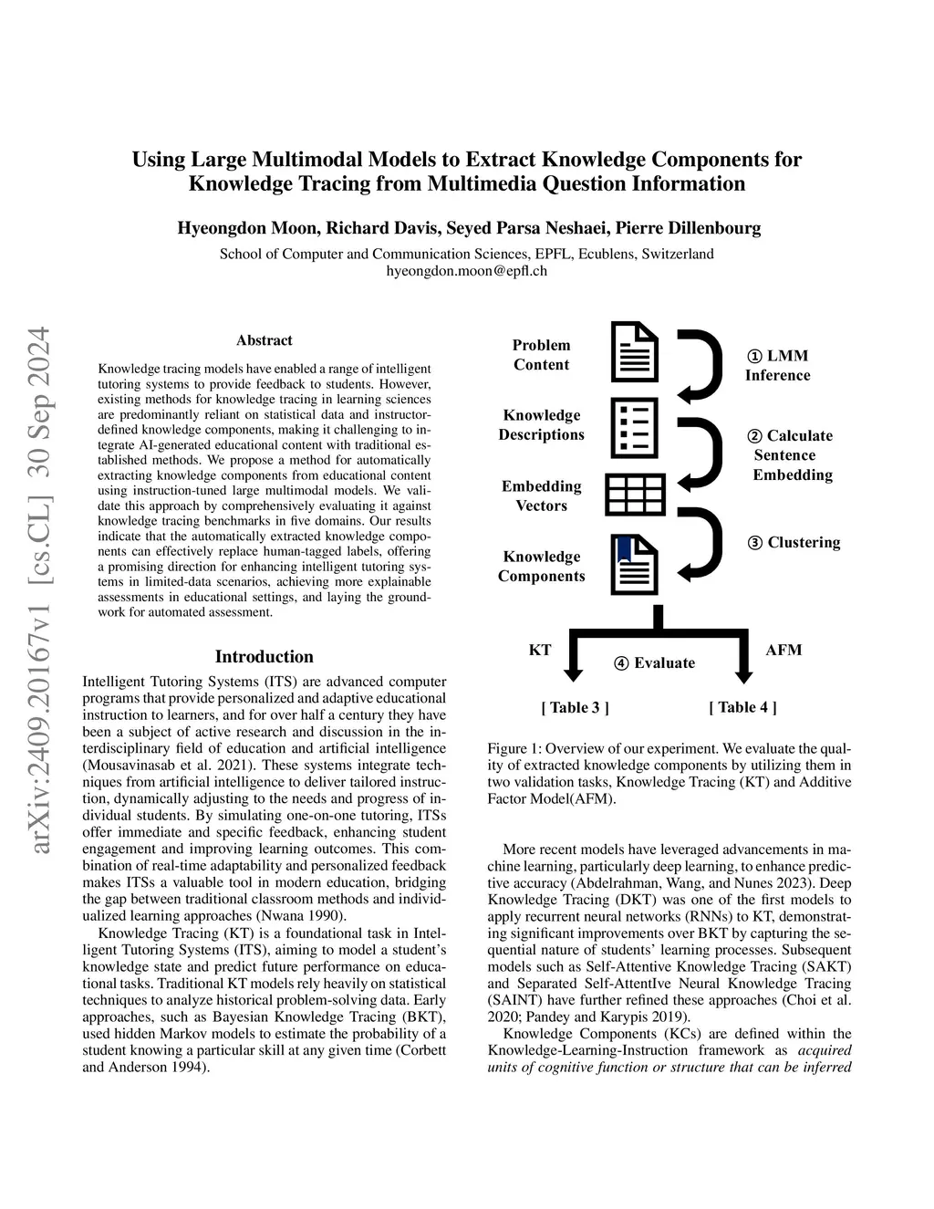 Knowledge tracing models have enabled a range of intelligent tutoring systems to provide feedback to students. However, existing methods for knowledge tracing in learning sciences are predominantly reliant on statistical data and instructor-defined knowledge components, making it challenging to integrate AI-generated educational content with traditional established methods. We propose a method for automatically extracting knowledge components from educational content using instruction-tuned large multimodal models. We validate this approach by comprehensively evaluating it against knowledge tracing benchmarks in five domains. Our results indicate that the automatically extracted knowledge components can effectively replace human-tagged labels, offering a promising direction for enhancing intelligent tutoring systems in limited-data scenarios, achieving more explainable assessments in educational settings, and laying the groundwork for automated assessment.
