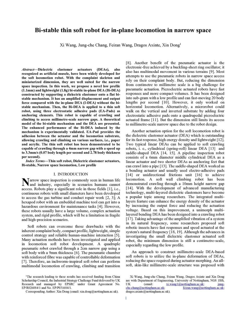 Dielectric elastomer actuators (DEAs), also recognized as artificial muscle, have been widely developed for the soft locomotion robot. With the complaint skeleton and miniaturized dimension, they are well suited for the narrow space inspection. In this work, we propose a novel low profile (1.1mm) and lightweight (1.8g) bi-stable in-plane DEA (Bi-DEA) constructed by supporting a dielectric elastomer onto a flat bi-stable mechanism. It has an amplified displacement and output force compared with the in-plane DEA (I-DEA) without the bi-stable mechanism. Then, the Bi-DEA is applied to a thin soft robot, using three electrostatic adhesive pads (EA-Pads) as anchoring elements. This robot is capable of crawling and climbing to access millimetre-scale narrow gaps. A theoretical model of the bi-stable mechanism and the DEA are presented. The enhanced performance of the Bi-DEA induced by the mechanism is experimentally validated. EA-Pad provides the adhesion between the actuator and the locomotion substrate, allowing crawling and climbing on various surfaces, i.e., paper and acrylic. The thin soft robot has been demonstrated to be capable of crawling through a 4mm narrow gap with a speed up to 3.3mm/s (0.07 body length per second and 2.78 body thickness per second).