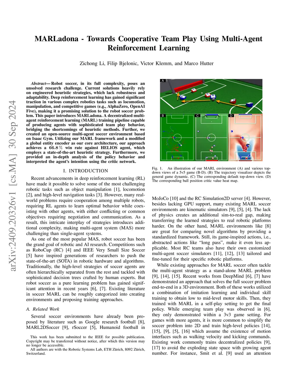 Robot soccer, in its full complexity, poses an unsolved research challenge. Current solutions heavily rely on engineered heuristic strategies, which lack robustness and adaptability. Deep reinforcement learning has gained significant traction in various complex robotics tasks such as locomotion, manipulation, and competitive games (e.g., AlphaZero, OpenAI Five), making it a promising solution to the robot soccer problem. This paper introduces MARLadona. A decentralized multi-agent reinforcement learning (MARL) training pipeline capable of producing agents with sophisticated team play behavior, bridging the shortcomings of heuristic methods. Further, we created an open-source multi-agent soccer environment based on Isaac Gym. Utilizing our MARL framework and a modified a global entity encoder as our core architecture, our approach achieves a 66.8% win rate against HELIOS agent, which employs a state-of-the-art heuristic strategy. Furthermore, we provided an in-depth analysis of the policy behavior and interpreted the agent's intention using the critic network.