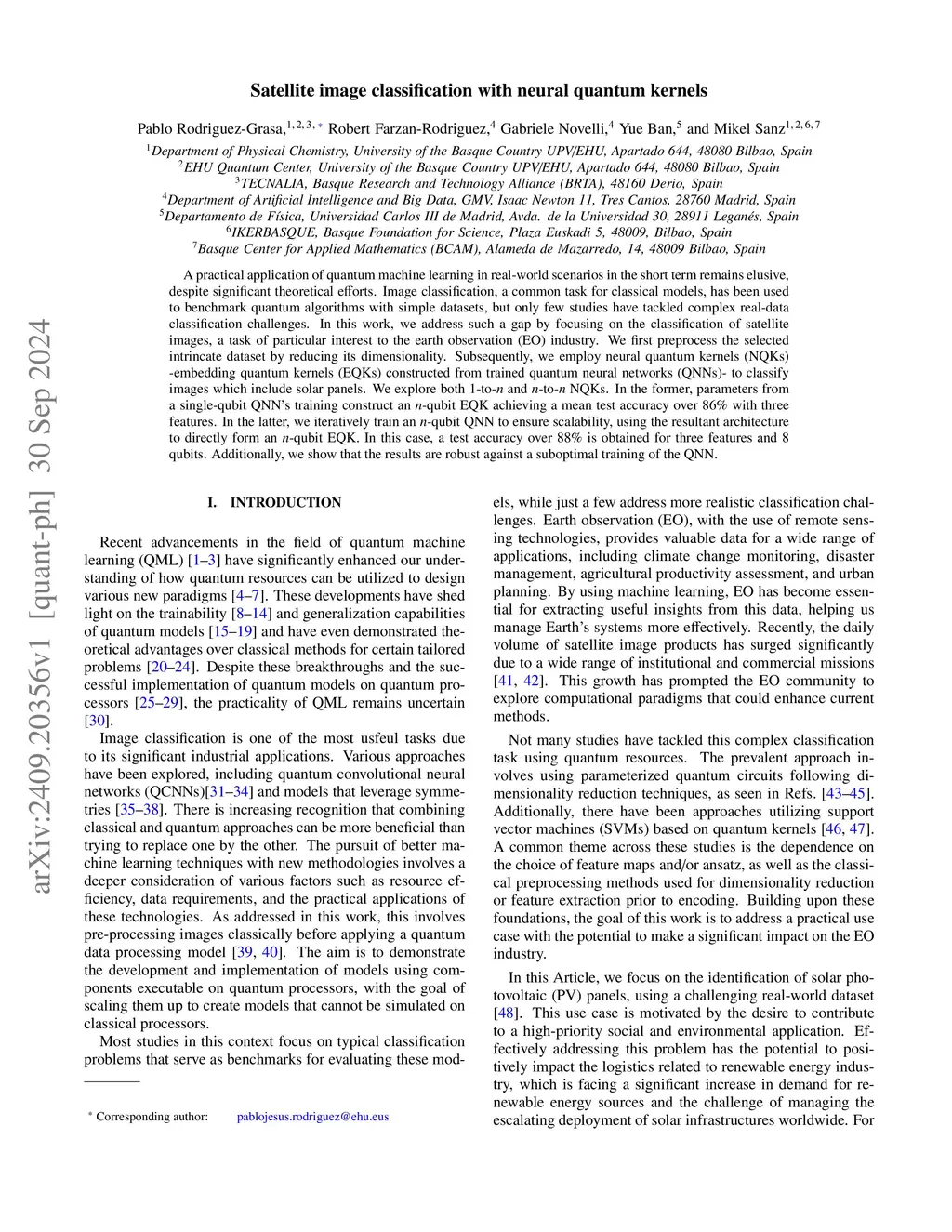 Achieving practical applications of quantum machine learning for real-world scenarios remains challenging despite significant theoretical progress. This paper proposes a novel approach for classifying satellite images, a task of particular relevance to the earth observation (EO) industry, using quantum machine learning techniques. Specifically, we focus on classifying images that contain solar panels, addressing a complex real-world classification problem. Our approach begins with classical pre-processing to reduce the dimensionality of the satellite image dataset. We then apply neural quantum kernels (NQKs)-quantum kernels derived from trained quantum neural networks (QNNs)-for classification. We evaluate several strategies within this framework, demonstrating results that are competitive with the best classical methods. Key findings include the robustness of or results and their scalability, with successful performance achieved up to 8 qubits.