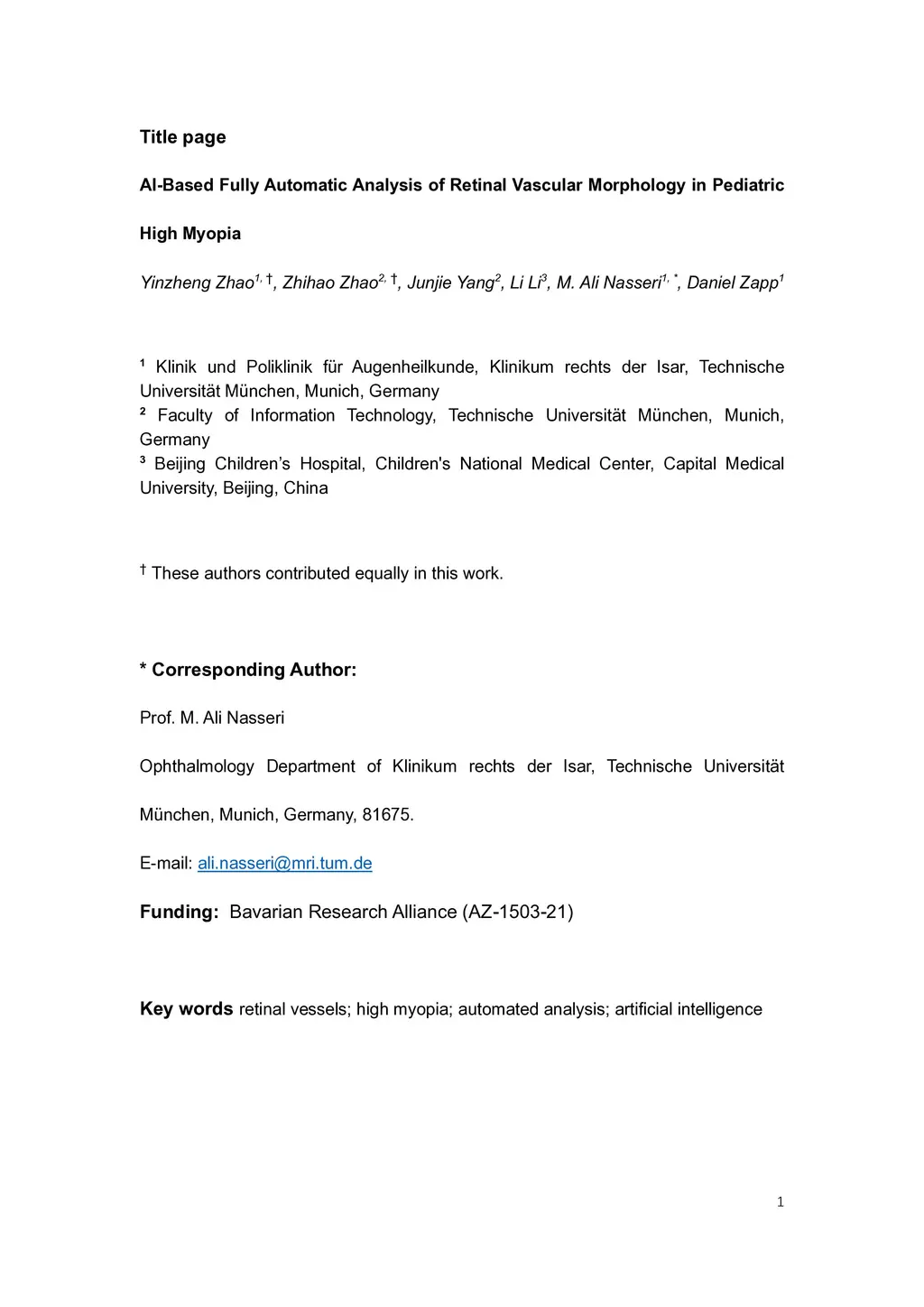 Purpose: To investigate the changes in retinal vascular structures associated various stages of myopia by designing automated software based on an artif intelligencemodel. Methods: The study involved 1324 pediatric participants from the National Childr Medical Center in China, and 2366 high-quality retinal images and correspon refractive parameters were obtained and analyzed. Spherical equivalent refrac(SER) degree was calculated. We proposed a data analysis model based c combination of the Convolutional Neural Networks (CNN) model and the atter module to classify images, segment vascular structures, and measure vasc parameters, such as main angle (MA), branching angle (BA), bifurcation edge al(BEA) and bifurcation edge coefficient (BEC). One-way ANOVA compared param measurements betweenthenormalfundus,lowmyopia,moderate myopia,and high myopia group. Results: There were 279 (12.38%) images in normal group and 384 (16.23%) images in the high myopia group. Compared normal fundus, the MA of fundus vessels in different myopic refractive groups significantly reduced (P = 0.006, P = 0.004, P = 0.019, respectively), and performance of the venous system was particularly obvious (P<0.001). At the sa time, the BEC decreased disproportionately (P<0.001). Further analysis of fundus vascular parameters at different degrees of myopia showed that there were also significant differences in BA and branching coefficient (BC). The arterial BA value of the fundus vessel in the high myopia group was lower than that of other groups (P : 0.032, 95% confidence interval [Ci], 0.22-4.86), while the venous BA values increased(P = 0.026). The BEC values of high myopia were higher than those of low and moderate myopia groups. When the loss function of our data classification model converged to 0.09,the model accuracy reached 94.19%