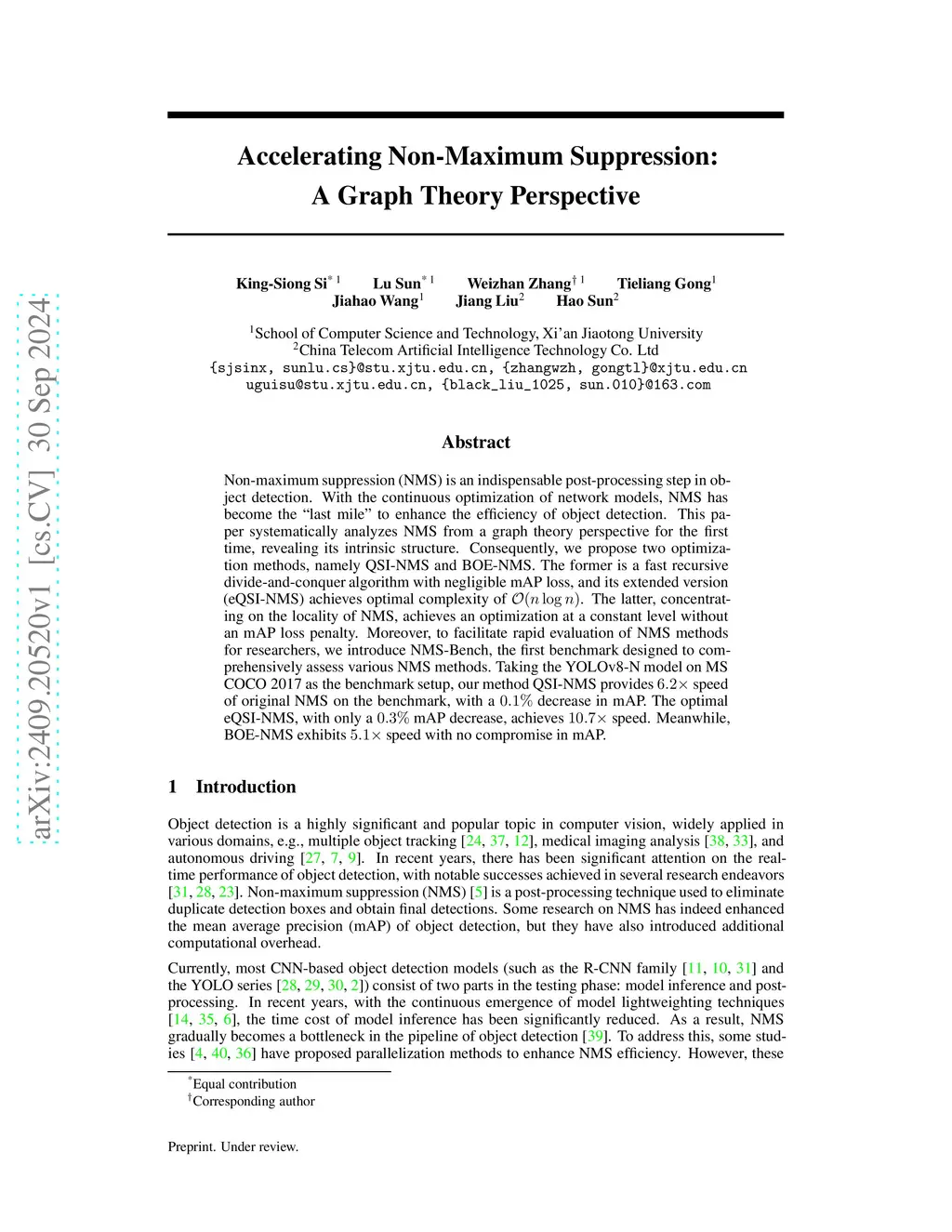 Non-maximum suppression (NMS) is an indispensable post-processing step in object detection. With the continuous optimization of network models, NMS has become the ``last mile'' to enhance the efficiency of object detection. This paper systematically analyzes NMS from a graph theory perspective for the first time, revealing its intrinsic structure. Consequently, we propose two optimization methods, namely QSI-NMS and BOE-NMS. The former is a fast recursive divide-and-conquer algorithm with negligible mAP loss, and its extended version (eQSI-NMS) achieves optimal complexity of . The latter, concentrating on the locality of NMS, achieves an optimization at a constant level without an mAP loss penalty. Moreover, to facilitate rapid evaluation of NMS methods for researchers, we introduce NMS-Bench, the first benchmark designed to comprehensively assess various NMS methods. Taking the YOLOv8-N model on MS COCO 2017 as the benchmark setup, our method QSI-NMS provides speed of original NMS on the benchmark, with a decrease in mAP. The optimal eQSI-NMS, with only a mAP decrease, achieves speed. Meanwhile, BOE-NMS exhibits speed with no compromise in mAP.