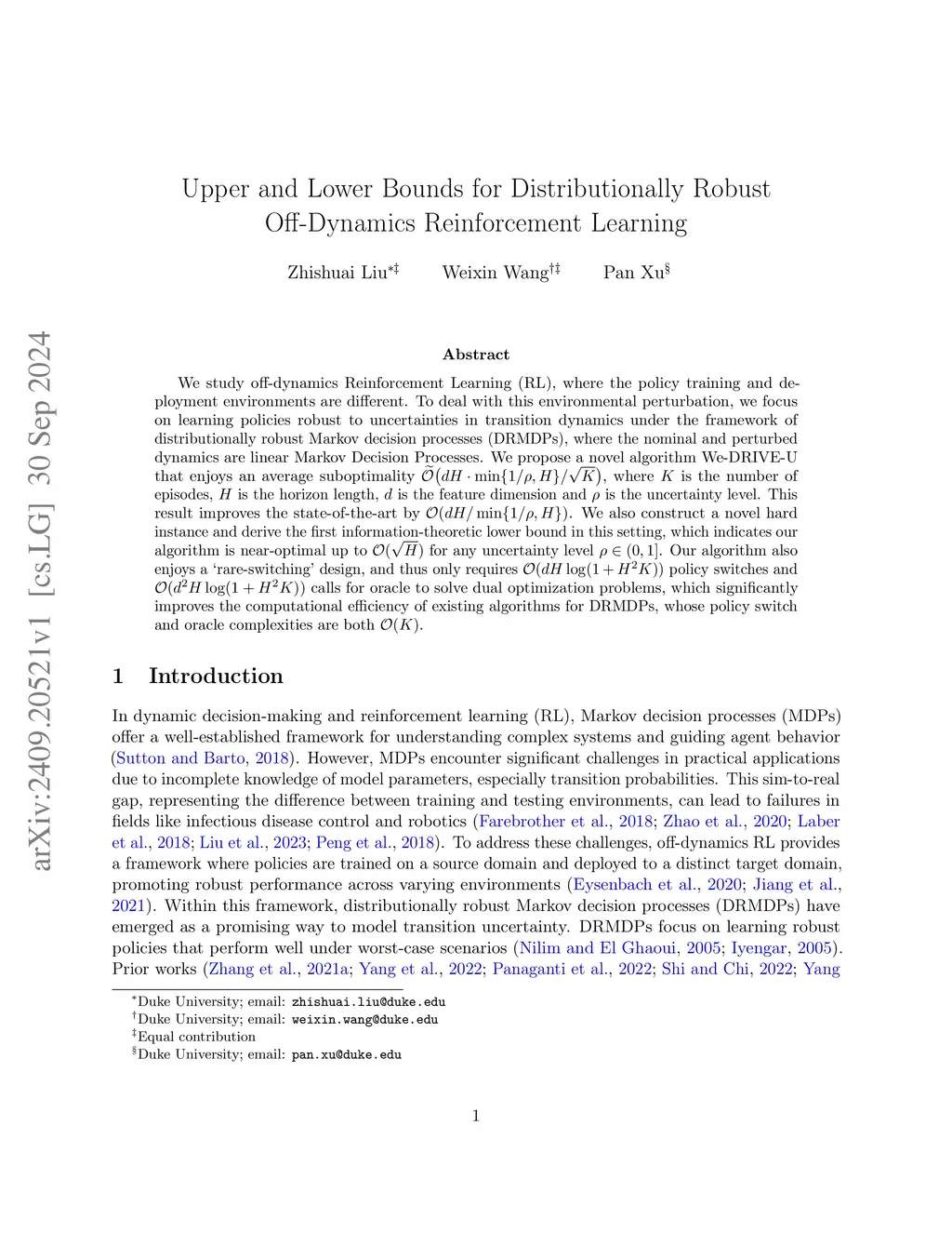 We study off-dynamics Reinforcement Learning (RL), where the policy training and deployment environments are different. To deal with this environmental perturbation, we focus on learning policies robust to uncertainties in transition dynamics under the framework of distributionally robust Markov decision processes (DRMDPs), where the nominal and perturbed dynamics are linear Markov Decision Processes. We propose a novel algorithm We-DRIVE-U that enjoys an average suboptimality , where is the number of episodes, is the horizon length, is the feature dimension and is the uncertainty level. This result improves the state-of-the-art by . We also construct a novel hard instance and derive the first information-theoretic lower bound in this setting, which indicates our algorithm is near-optimal up to for any uncertainty level . Our algorithm also enjoys a 'rare-switching' design, and thus only requires policy switches and calls for oracle to solve dual optimization problems, which significantly improves the computational efficiency of existing algorithms for DRMDPs, whose policy switch and oracle complexities are both .