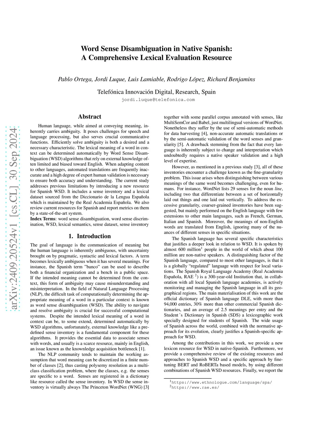 Human language, while aimed at conveying meaning, inherently carries ambiguity. It poses challenges for speech and language processing, but also serves crucial communicative functions. Efficiently solve ambiguity is both a desired and a necessary characteristic. The lexical meaning of a word in context can be determined automatically by Word Sense Disambiguation (WSD) algorithms that rely on external knowledge often limited and biased toward English. When adapting content to other languages, automated translations are frequently inaccurate and a high degree of expert human validation is necessary to ensure both accuracy and understanding. The current study addresses previous limitations by introducing a new resource for Spanish WSD. It includes a sense inventory and a lexical dataset sourced from the Diccionario de la Lengua Espa\~nola which is maintained by the Real Academia Espa\~nola. We also review current resources for Spanish and report metrics on them by a state-of-the-art system.