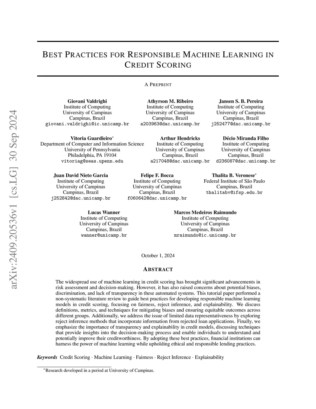 The widespread use of machine learning in credit scoring has brought significant advancements in risk assessment and decision-making. However, it has also raised concerns about potential biases, discrimination, and lack of transparency in these automated systems. This tutorial paper performed a non-systematic literature review to guide best practices for developing responsible machine learning models in credit scoring, focusing on fairness, reject inference, and explainability. We discuss definitions, metrics, and techniques for mitigating biases and ensuring equitable outcomes across different groups. Additionally, we address the issue of limited data representativeness by exploring reject inference methods that incorporate information from rejected loan applications. Finally, we emphasize the importance of transparency and explainability in credit models, discussing techniques that provide insights into the decision-making process and enable individuals to understand and potentially improve their creditworthiness. By adopting these best practices, financial institutions can harness the power of machine learning while upholding ethical and responsible lending practices.