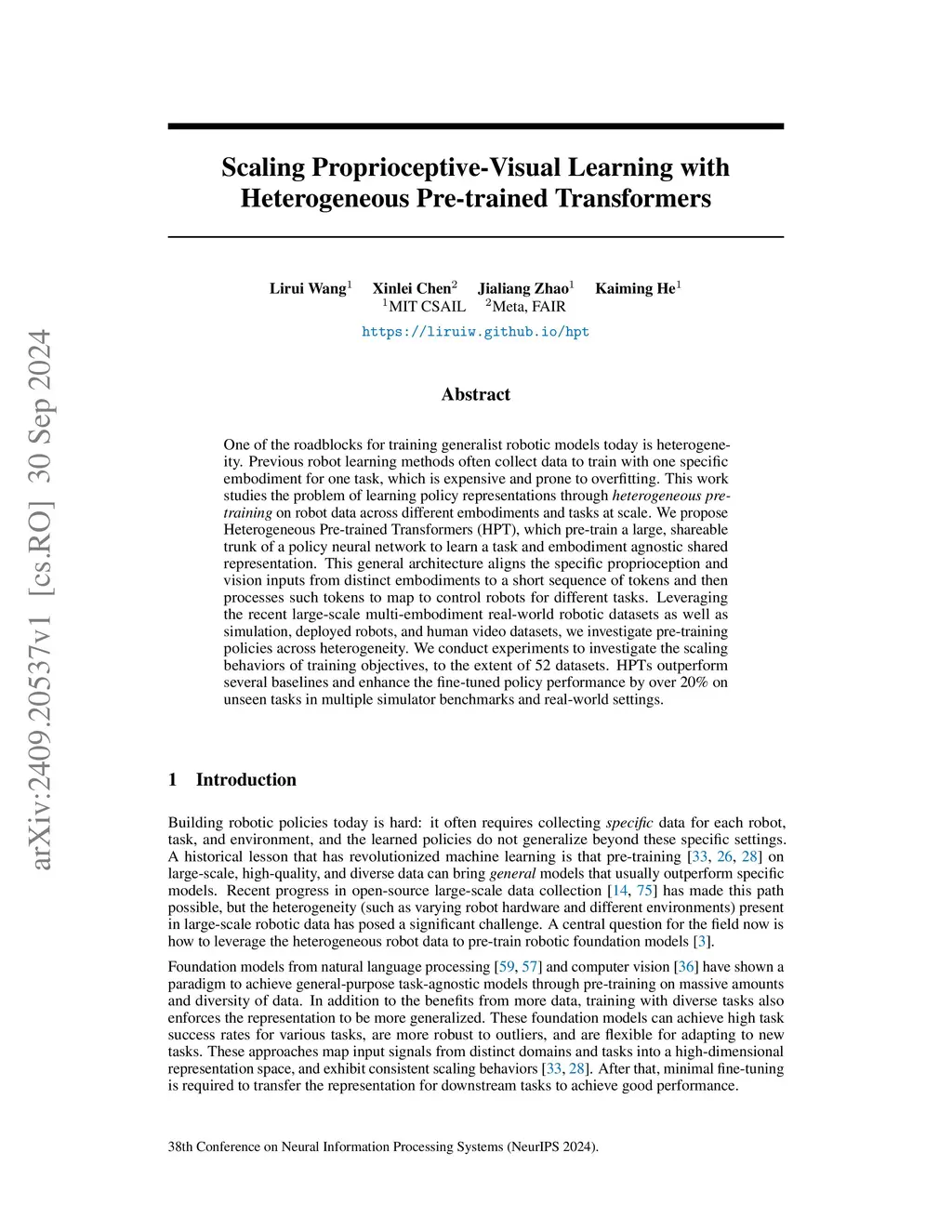 One of the roadblocks for training generalist robotic models today is heterogeneity. Previous robot learning methods often collect data to train with one specific embodiment for one task, which is expensive and prone to overfitting. This work studies the problem of learning policy representations through heterogeneous pre-training on robot data across different embodiments and tasks at scale. We propose Heterogeneous Pre-trained Transformers (HPT), which pre-train a large, shareable trunk of a policy neural network to learn a task and embodiment agnostic shared representation. This general architecture aligns the specific proprioception and vision inputs from distinct embodiments to a short sequence of tokens and then processes such tokens to map to control robots for different tasks. Leveraging the recent large-scale multi-embodiment real-world robotic datasets as well as simulation, deployed robots, and human video datasets, we investigate pre-training policies across heterogeneity. We conduct experiments to investigate the scaling behaviors of training objectives, to the extent of 52 datasets. HPTs outperform several baselines and enhance the fine-tuned policy performance by over 20% on unseen tasks in multiple simulator benchmarks and real-world settings. See the project website (https://liruiw.github.io/hpt/) for code and videos.