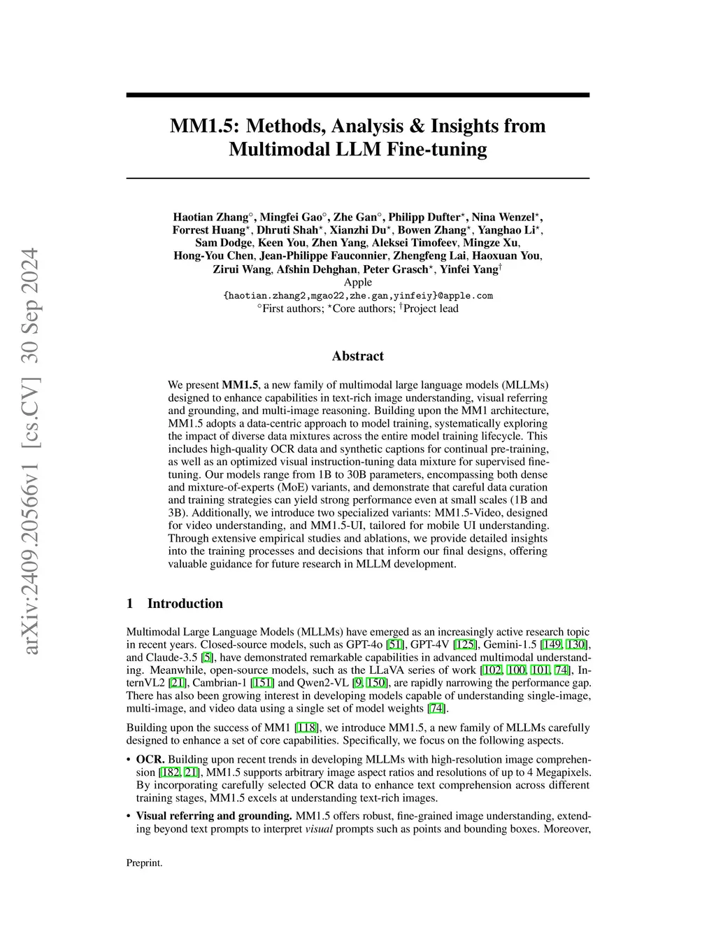 We present MM1.5, a new family of multimodal large language models (MLLMs) designed to enhance capabilities in text-rich image understanding, visual referring and grounding, and multi-image reasoning. Building upon the MM1 architecture, MM1.5 adopts a data-centric approach to model training, systematically exploring the impact of diverse data mixtures across the entire model training lifecycle. This includes high-quality OCR data and synthetic captions for continual pre-training, as well as an optimized visual instruction-tuning data mixture for supervised fine-tuning. Our models range from 1B to 30B parameters, encompassing both dense and mixture-of-experts (MoE) variants, and demonstrate that careful data curation and training strategies can yield strong performance even at small scales (1B and 3B). Additionally, we introduce two specialized variants: MM1.5-Video, designed for video understanding, and MM1.5-UI, tailored for mobile UI understanding. Through extensive empirical studies and ablations, we provide detailed insights into the training processes and decisions that inform our final designs, offering valuable guidance for future research in MLLM development.