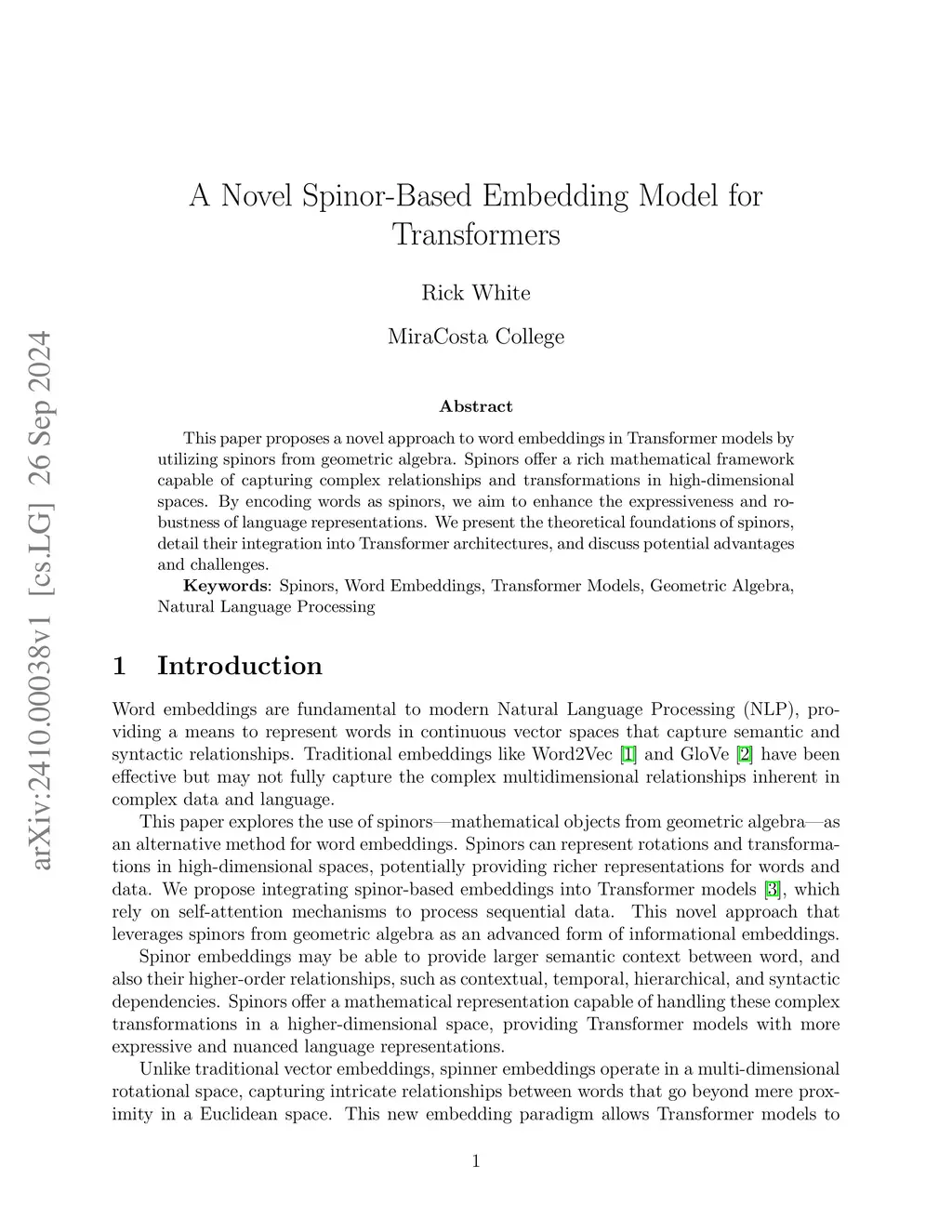 This paper proposes a novel approach to word embeddings in Transformer models by utilizing spinors from geometric algebra. Spinors offer a rich mathematical framework capable of capturing complex relationships and transformations in high-dimensional spaces. By encoding words as spinors, we aim to enhance the expressiveness and robustness of language representations. We present the theoretical foundations of spinors, detail their integration into Transformer architectures, and discuss potential advantages and challenges.