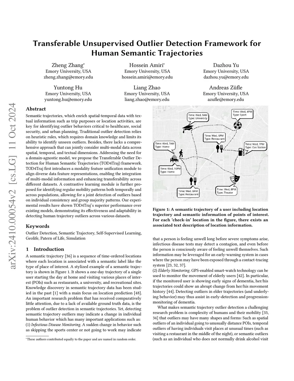 Semantic trajectories, which enrich spatial-temporal data with textual information such as trip purposes or location activities, are key for identifying outlier behaviors critical to healthcare, social security, and urban planning. Traditional outlier detection relies on heuristic rules, which requires domain knowledge and limits its ability to identify unseen outliers. Besides, there lacks a comprehensive approach that can jointly consider multi-modal data across spatial, temporal, and textual dimensions. Addressing the need for a domain-agnostic model, we propose the Transferable Outlier Detection for Human Semantic Trajectories (TOD4Traj) framework.TOD4Traj first introduces a modality feature unification module to align diverse data feature representations, enabling the integration of multi-modal information and enhancing transferability across different datasets. A contrastive learning module is further pro-posed for identifying regular mobility patterns both temporally and across populations, allowing for a joint detection of outliers based on individual consistency and group majority patterns. Our experimental results have shown TOD4Traj's superior performance over existing models, demonstrating its effectiveness and adaptability in detecting human trajectory outliers across various datasets.