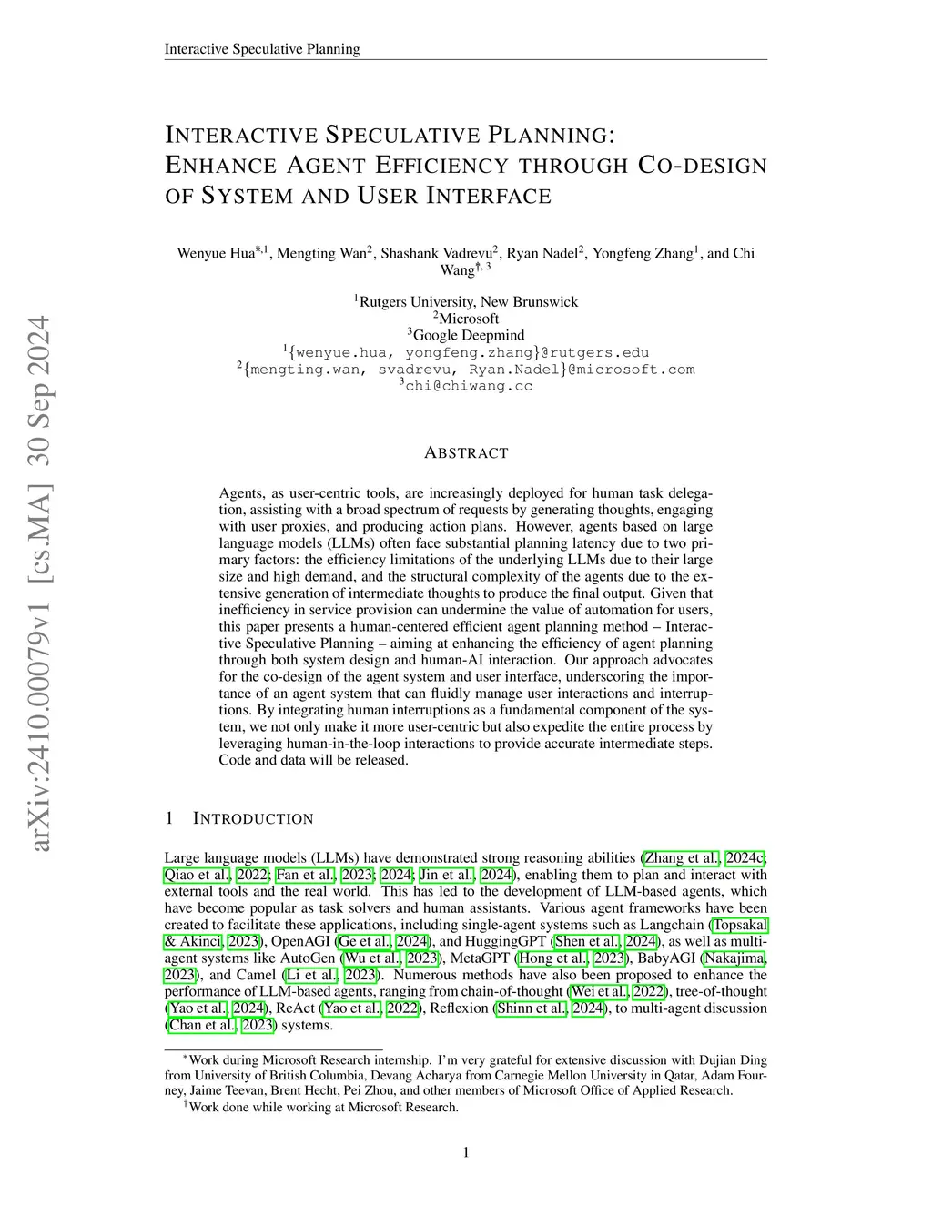 Interactive Speculative Planning: Enhance Agent Efficiency through