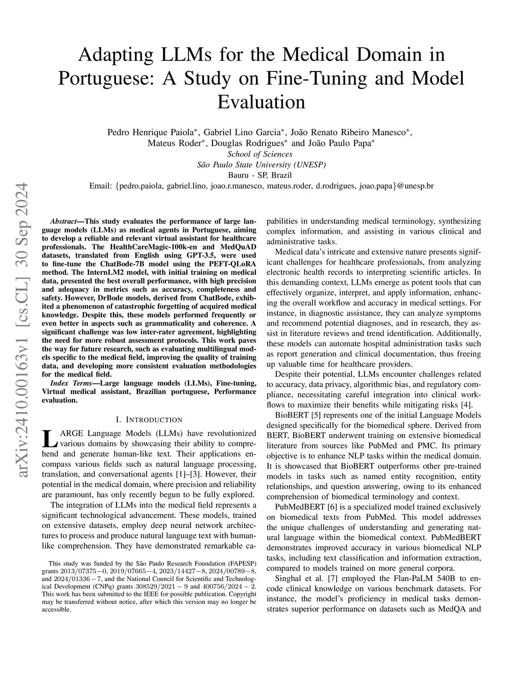 This study evaluates the performance of large language models (LLMs) as medical agents in Portuguese, aiming to develop a reliable and relevant virtual assistant for healthcare professionals. The HealthCareMagic-100k-en and MedQuAD datasets, translated from English using GPT-3.5, were used to fine-tune the ChatBode-7B model using the PEFT-QLoRA method. The InternLM2 model, with initial training on medical data, presented the best overall performance, with high precision and adequacy in metrics such as accuracy, completeness and safety. However, DrBode models, derived from ChatBode, exhibited a phenomenon of catastrophic forgetting of acquired medical knowledge. Despite this, these models performed frequently or even better in aspects such as grammaticality and coherence. A significant challenge was low inter-rater agreement, highlighting the need for more robust assessment protocols. This work paves the way for future research, such as evaluating multilingual models specific to the medical field, improving the quality of training data, and developing more consistent evaluation methodologies for the medical field.