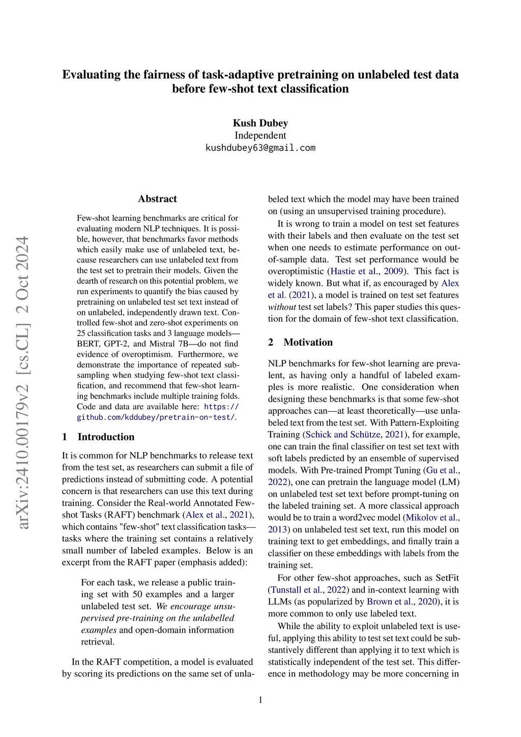 Few-shot learning benchmarks are critical for evaluating modern NLP techniques. It is possible, however, that benchmarks favor methods which easily make use of unlabeled text, because researchers can use unlabeled text from the test set to pretrain their models. Given the dearth of research on this potential problem, we run experiments to quantify the bias caused by pretraining on unlabeled test set text instead of on unlabeled, independently drawn text. Controlled few-shot and zero-shot experiments on 25 classification tasks and 3 language models -- BERT, GPT-2, and Mistral 7B -- do not find evidence of overoptimism. Furthermore, we demonstrate the importance of repeated subsampling when studying few-shot text classification, and recommend that few-shot learning benchmarks include multiple training folds. Code and data are available at https://github.com/kddubey/pretrain-on-test/.