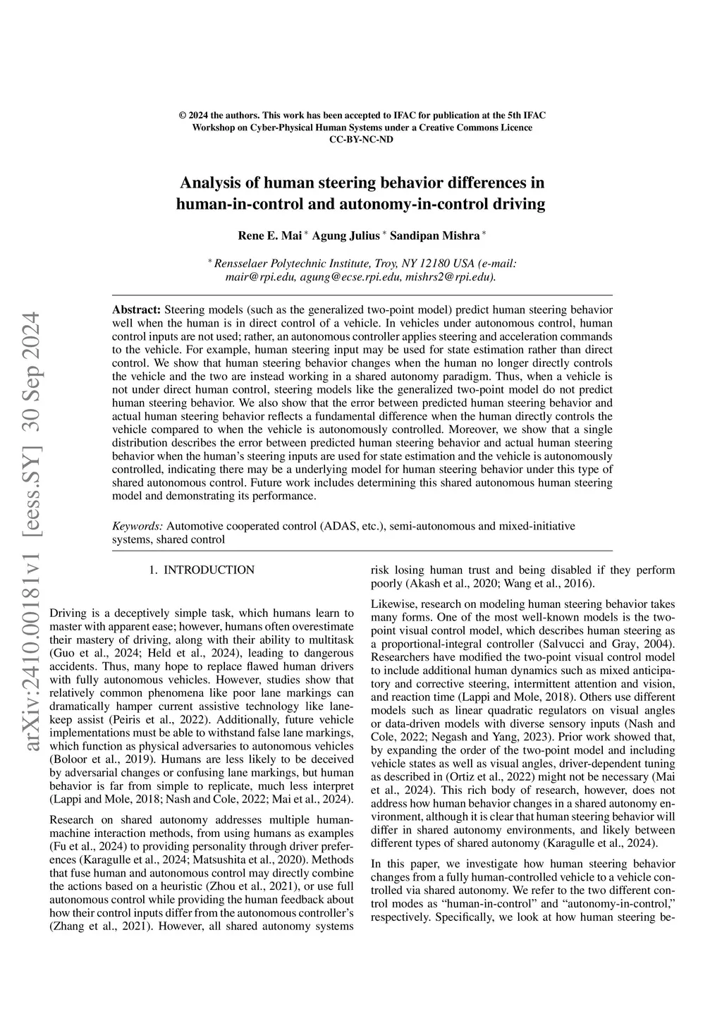 Steering models (such as the generalized two-point model) predict human steering behavior well when the human is in direct control of a vehicle. In vehicles under autonomous control, human control inputs are not used; rather, an autonomous controller applies steering and acceleration commands to the vehicle. For example, human steering input may be used for state estimation rather than direct control. We show that human steering behavior changes when the human no longer directly controls the vehicle and the two are instead working in a shared autonomy paradigm. Thus, when a vehicle is not under direct human control, steering models like the generalized two-point model do not predict human steering behavior. We also show that the error between predicted human steering behavior and actual human steering behavior reflects a fundamental difference when the human directly controls the vehicle compared to when the vehicle is autonomously controlled. Moreover, we show that a single distribution describes the error between predicted human steering behavior and actual human steering behavior when the human's steering inputs are used for state estimation and the vehicle is autonomously controlled, indicating there may be a underlying model for human steering behavior under this type of shared autonomous control. Future work includes determining this shared autonomous human steering model and demonstrating its performance.