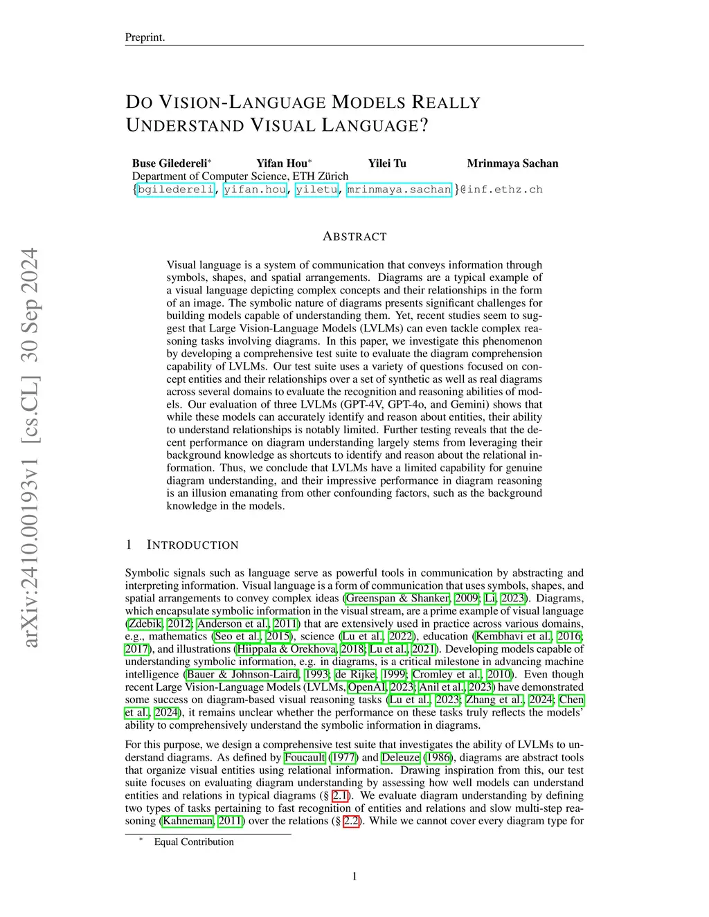 Visual language is a system of communication that conveys information through symbols, shapes, and spatial arrangements. Diagrams are a typical example of a visual language depicting complex concepts and their relationships in the form of an image. The symbolic nature of diagrams presents significant challenges for building models capable of understanding them. Recent studies suggest that Large Vision-Language Models (LVLMs) can even tackle complex reasoning tasks involving diagrams. In this paper, we investigate this phenomenon by developing a comprehensive test suite to evaluate the diagram comprehension capability of LVLMs. Our test suite uses a variety of questions focused on concept entities and their relationships over a set of synthetic as well as real diagrams across domains to evaluate the recognition and reasoning abilities of models. Our evaluation of LVLMs shows that while they can accurately identify and reason about entities, their ability to understand relationships is notably limited. Further testing reveals that the decent performance on diagram understanding largely stems from leveraging their background knowledge as shortcuts to identify and reason about the relational information. Thus, we conclude that LVLMs have a limited capability for genuine diagram understanding, and their impressive performance in diagram reasoning is an illusion emanating from other confounding factors, such as the background knowledge in the models.