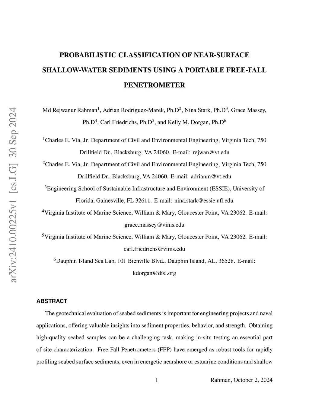 Probabilistic Classification of Near-Surface Shallow-Water Sediments using A Portable Free-Fall Penetrometer