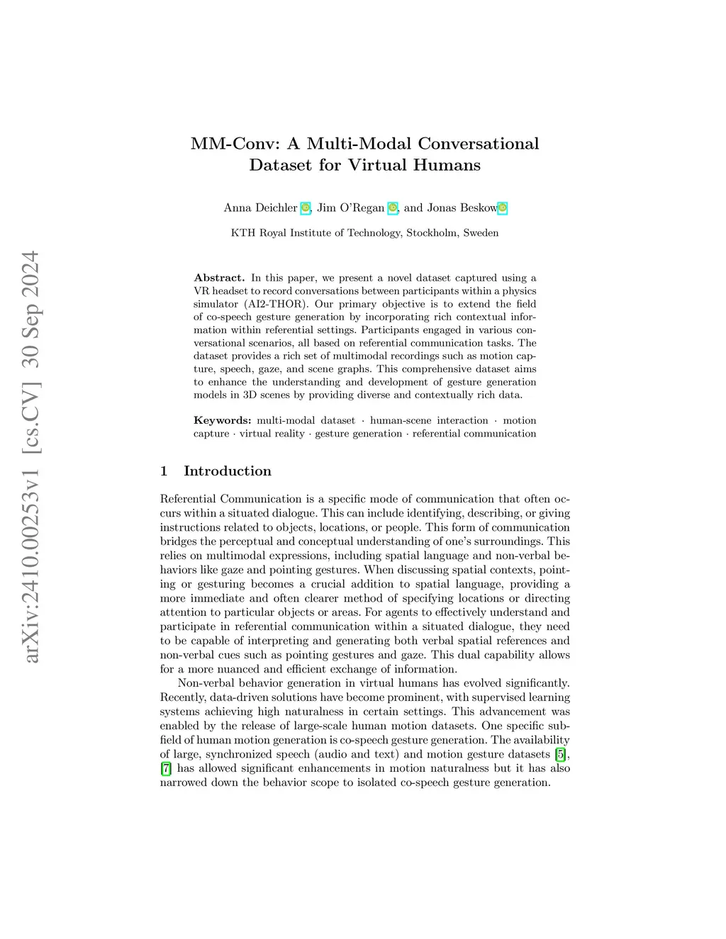 MM-Conv: A Multi-modal Conversational Dataset for Virtual Humans