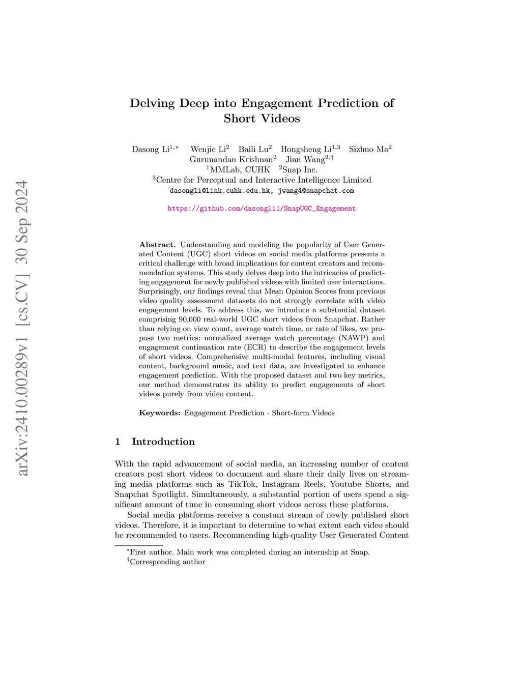 Understanding and modeling the popularity of User Generated Content (UGC) short videos on social media platforms presents a critical challenge with broad implications for content creators and recommendation systems. This study delves deep into the intricacies of predicting engagement for newly published videos with limited user interactions. Surprisingly, our findings reveal that Mean Opinion Scores from previous video quality assessment datasets do not strongly correlate with video engagement levels. To address this, we introduce a substantial dataset comprising 90,000 real-world UGC short videos from Snapchat. Rather than relying on view count, average watch time, or rate of likes, we propose two metrics: normalized average watch percentage (NAWP) and engagement continuation rate (ECR) to describe the engagement levels of short videos. Comprehensive multi-modal features, including visual content, background music, and text data, are investigated to enhance engagement prediction. With the proposed dataset and two key metrics, our method demonstrates its ability to predict engagements of short videos purely from video content.