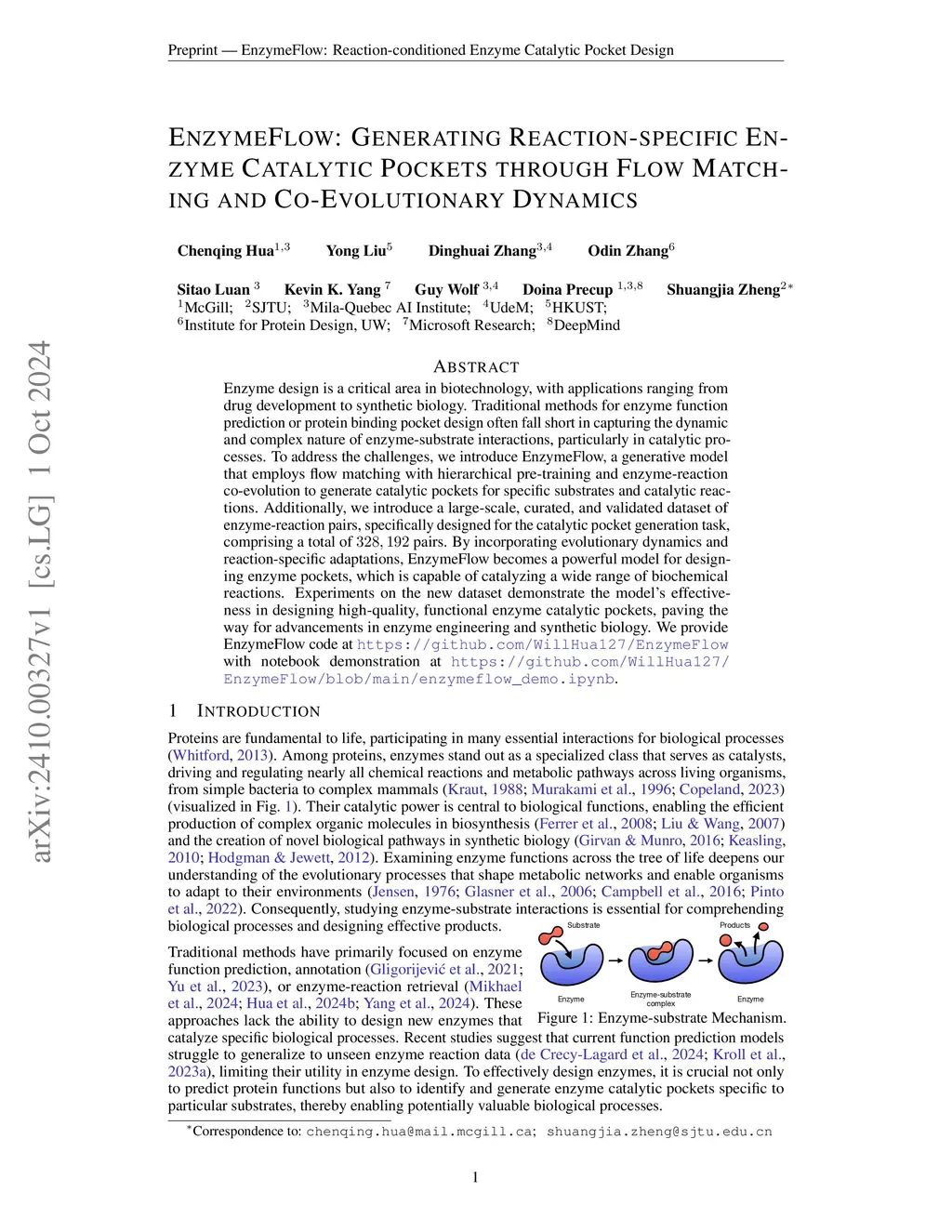 Enzyme design is a critical area in biotechnology, with applications ranging from drug development to synthetic biology. Traditional methods for enzyme function prediction or protein binding pocket design often fall short in capturing the dynamic and complex nature of enzyme-substrate interactions, particularly in catalytic processes. To address the challenges, we introduce EnzymeFlow, a generative model that employs flow matching with hierarchical pre-training and enzyme-reaction co-evolution to generate catalytic pockets for specific substrates and catalytic reactions. Additionally, we introduce a large-scale, curated, and validated dataset of enzyme-reaction pairs, specifically designed for the catalytic pocket generation task, comprising a total of pairs. By incorporating evolutionary dynamics and reaction-specific adaptations, EnzymeFlow becomes a powerful model for designing enzyme pockets, which is capable of catalyzing a wide range of biochemical reactions. Experiments on the new dataset demonstrate the model's effectiveness in designing high-quality, functional enzyme catalytic pockets, paving the way for advancements in enzyme engineering and synthetic biology. We provide EnzymeFlow code at https://github.com/WillHua127/EnzymeFlow with notebook demonstration at https://github.com/WillHua127/EnzymeFlow/blob/main/enzymeflow_demo.ipynb.