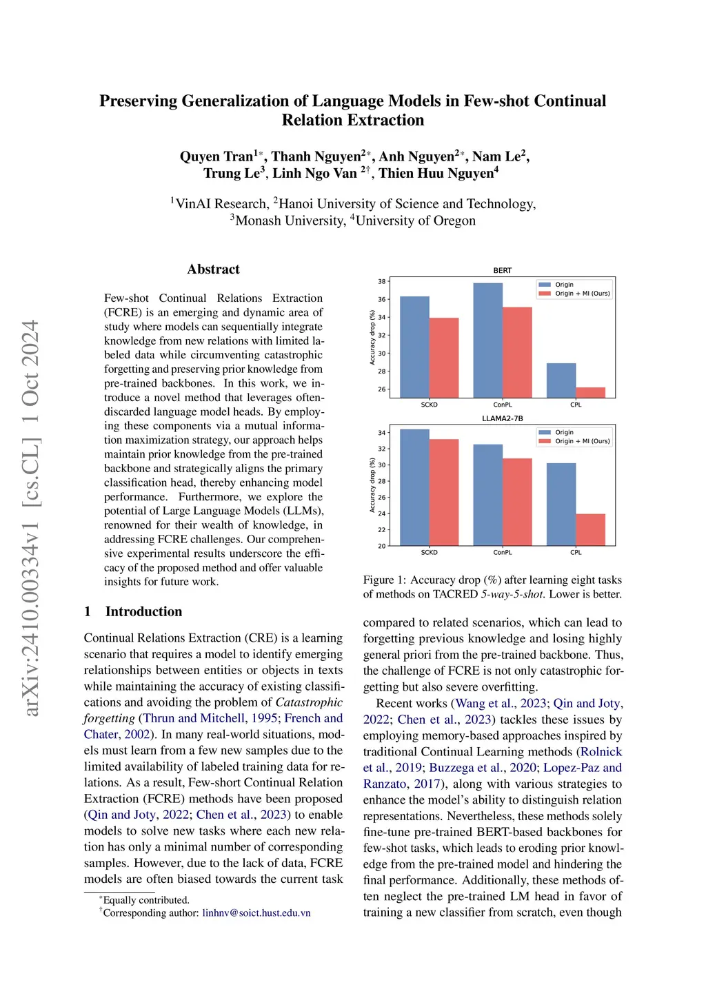 Few-shot Continual Relations Extraction (FCRE) is an emerging and dynamic area of study where models can sequentially integrate knowledge from new relations with limited labeled data while circumventing catastrophic forgetting and preserving prior knowledge from pre-trained backbones. In this work, we introduce a novel method that leverages often-discarded language model heads. By employing these components via a mutual information maximization strategy, our approach helps maintain prior knowledge from the pre-trained backbone and strategically aligns the primary classification head, thereby enhancing model performance. Furthermore, we explore the potential of Large Language Models (LLMs), renowned for their wealth of knowledge, in addressing FCRE challenges. Our comprehensive experimental results underscore the efficacy of the proposed method and offer valuable insights for future work.
