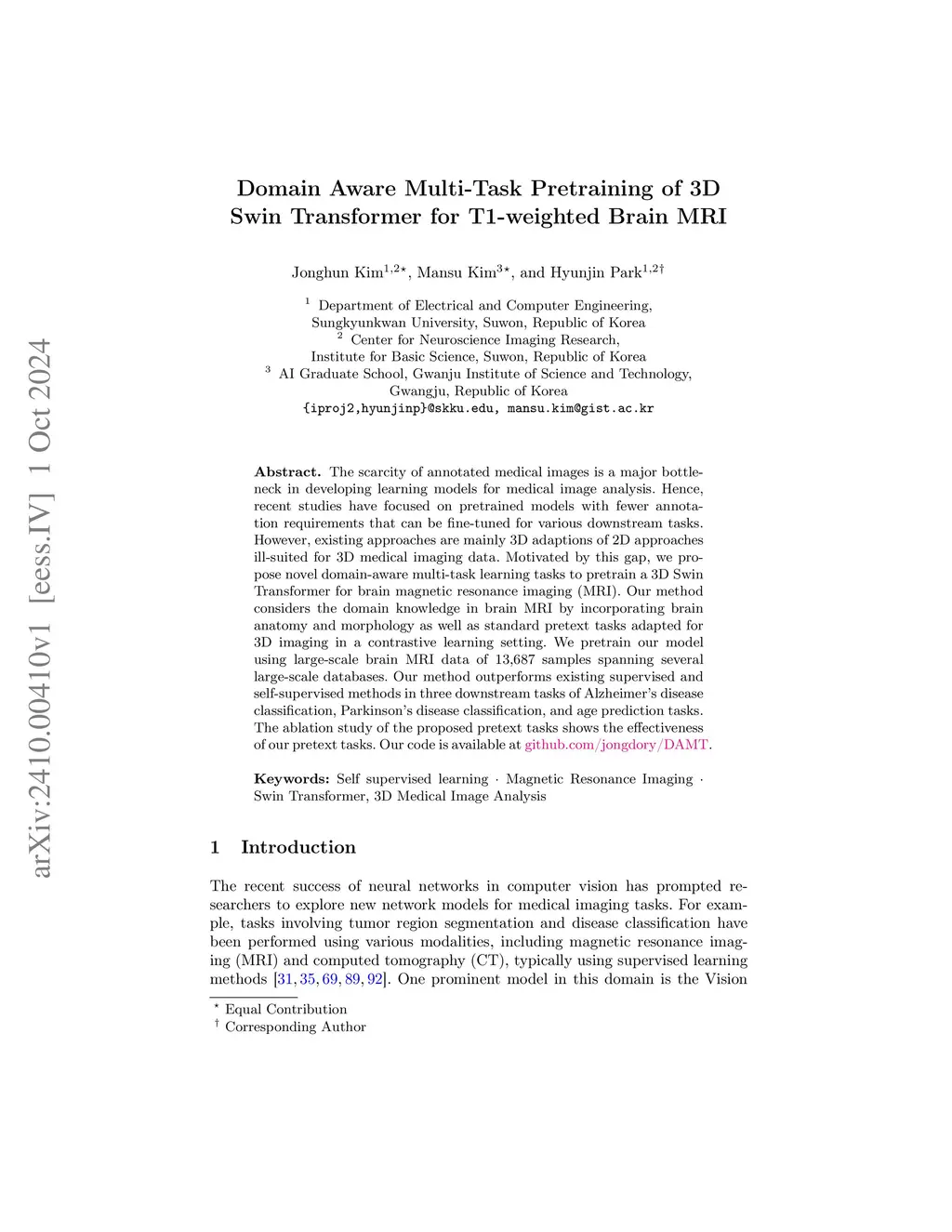 The scarcity of annotated medical images is a major bottleneck in developing learning models for medical image analysis. Hence, recent studies have focused on pretrained models with fewer annotation requirements that can be fine-tuned for various downstream tasks. However, existing approaches are mainly 3D adaptions of 2D approaches ill-suited for 3D medical imaging data. Motivated by this gap, we propose novel domain-aware multi-task learning tasks to pretrain a 3D Swin Transformer for brain magnetic resonance imaging (MRI). Our method considers the domain knowledge in brain MRI by incorporating brain anatomy and morphology as well as standard pretext tasks adapted for 3D imaging in a contrastive learning setting. We pretrain our model using large-scale brain MRI data of 13,687 samples spanning several large-scale databases. Our method outperforms existing supervised and self-supervised methods in three downstream tasks of Alzheimer's disease classification, Parkinson's disease classification, and age prediction tasks. The ablation study of the proposed pretext tasks shows the effectiveness of our pretext tasks.