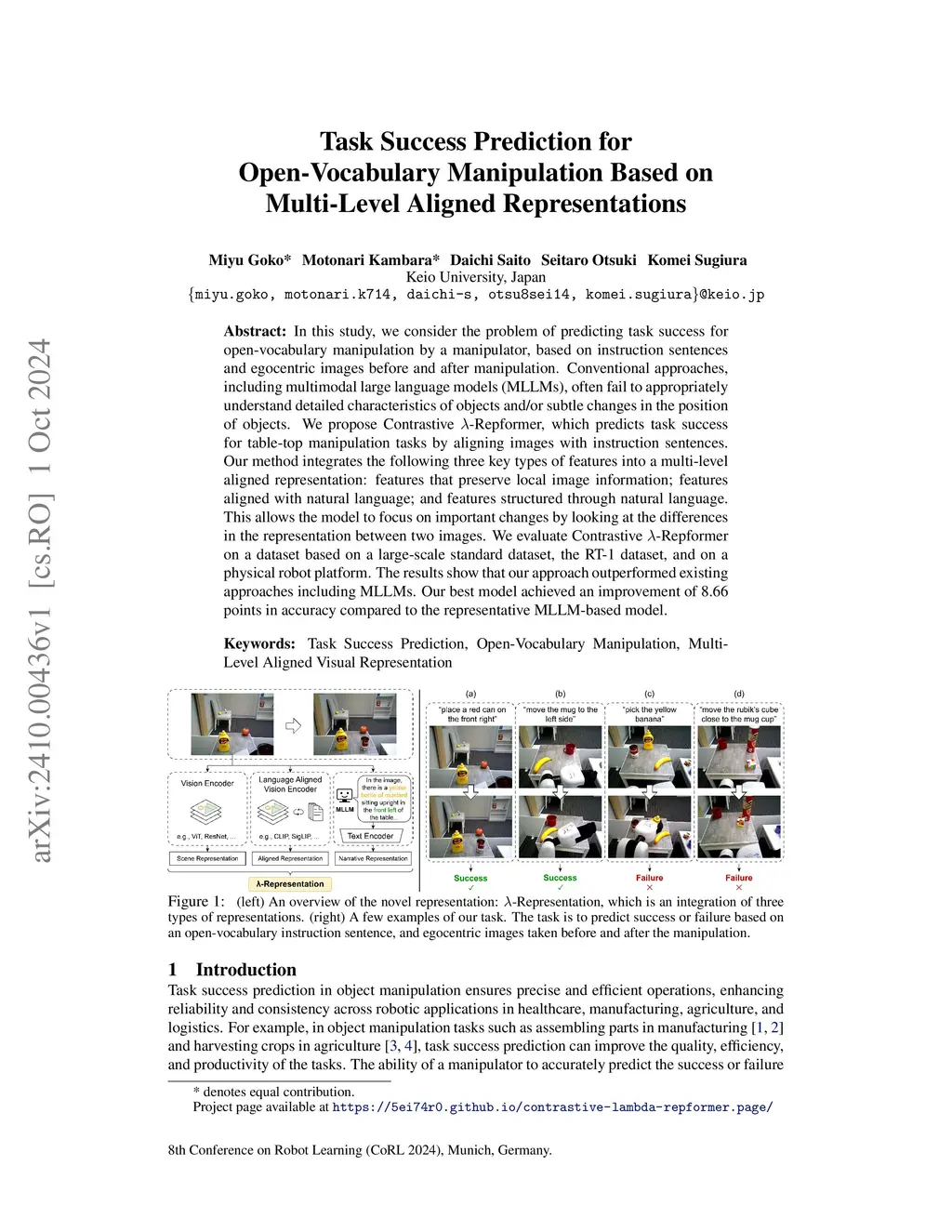 In this study, we consider the problem of predicting task success for open-vocabulary manipulation by a manipulator, based on instruction sentences and egocentric images before and after manipulation. Conventional approaches, including multimodal large language models (MLLMs), often fail to appropriately understand detailed characteristics of objects and/or subtle changes in the position of objects. We propose Contrastive -Repformer, which predicts task success for table-top manipulation tasks by aligning images with instruction sentences. Our method integrates the following three key types of features into a multi-level aligned representation: features that preserve local image information; features aligned with natural language; and features structured through natural language. This allows the model to focus on important changes by looking at the differences in the representation between two images. We evaluate Contrastive -Repformer on a dataset based on a large-scale standard dataset, the RT-1 dataset, and on a physical robot platform. The results show that our approach outperformed existing approaches including MLLMs. Our best model achieved an improvement of 8.66 points in accuracy compared to the representative MLLM-based model.