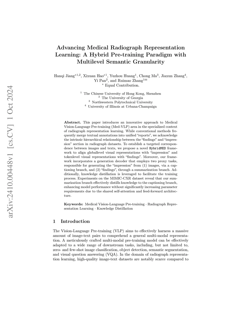 This paper introduces an innovative approach to Medical Vision-Language Pre-training (Med-VLP) area in the specialized context of radiograph representation learning. While conventional methods frequently merge textual annotations into unified reports, we acknowledge the intrinsic hierarchical relationship between the findings and impression section in radiograph datasets. To establish a targeted correspondence between images and texts, we propose a novel HybridMED framework to align global-level visual representations with impression and token-level visual representations with findings. Moreover, our framework incorporates a generation decoder that employs two proxy tasks, responsible for generating the impression from (1) images, via a captioning branch, and (2) findings, through a summarization branch. Additionally, knowledge distillation is leveraged to facilitate the training process. Experiments on the MIMIC-CXR dataset reveal that our summarization branch effectively distills knowledge to the captioning branch, enhancing model performance without significantly increasing parameter requirements due to the shared self-attention and feed-forward architecture.