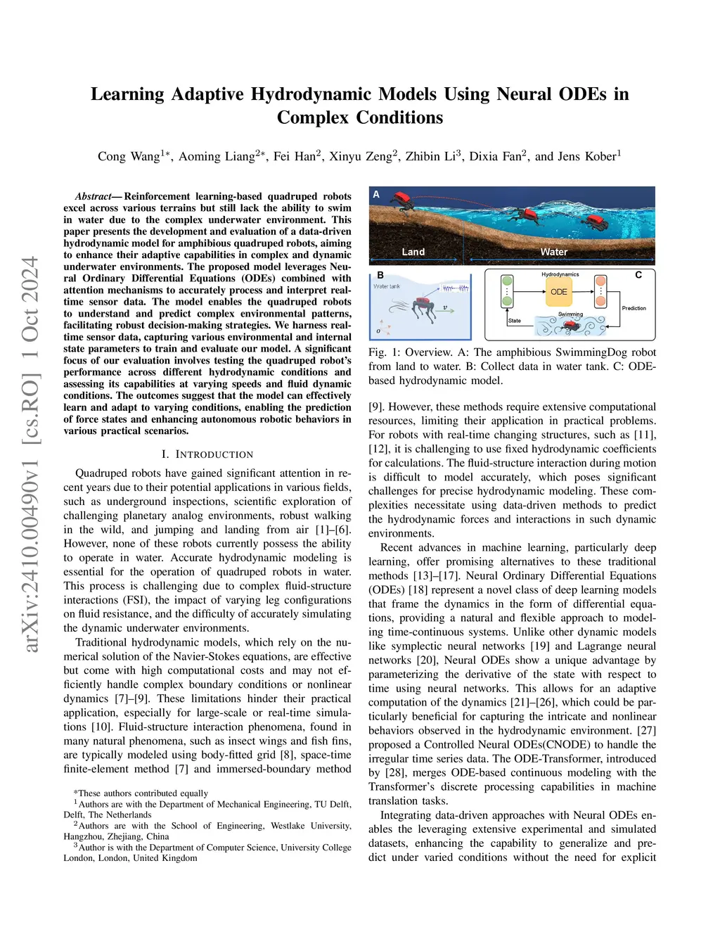 Reinforcement learning-based quadruped robots excel across various terrains but still lack the ability to swim in water due to the complex underwater environment. This paper presents the development and evaluation of a data-driven hydrodynamic model for amphibious quadruped robots, aiming to enhance their adaptive capabilities in complex and dynamic underwater environments. The proposed model leverages Neural Ordinary Differential Equations (ODEs) combined with attention mechanisms to accurately process and interpret real-time sensor data. The model enables the quadruped robots to understand and predict complex environmental patterns, facilitating robust decision-making strategies. We harness real-time sensor data, capturing various environmental and internal state parameters to train and evaluate our model. A significant focus of our evaluation involves testing the quadruped robot's performance across different hydrodynamic conditions and assessing its capabilities at varying speeds and fluid dynamic conditions. The outcomes suggest that the model can effectively learn and adapt to varying conditions, enabling the prediction of force states and enhancing autonomous robotic behaviors in various practical scenarios.