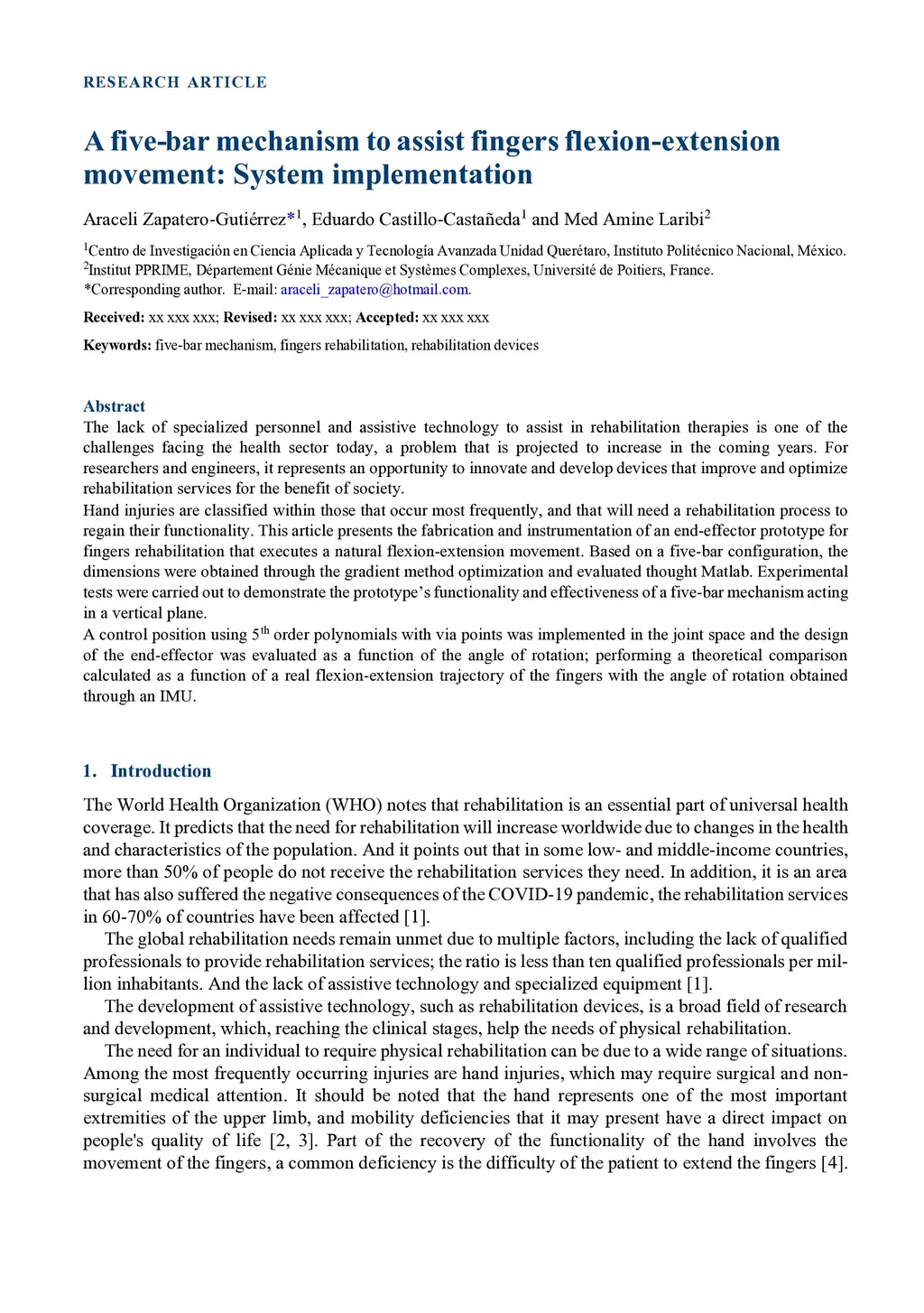A five-bar mechanism to assist finger flexion-extension movement: system